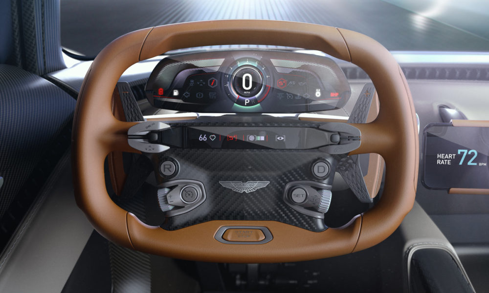 The minimalism we see is for a driver focused environment, apparently. Even for an infotainment system, Aston is thinking of a ‘bring-your-own’ technology, meaning a Smartphone. Also notice some of the driver health stats displayed on the steering-integrated display. However, all this smartphone idea might not make it to the final production version, as Aston is still in talks with the customers if they want such a thing.