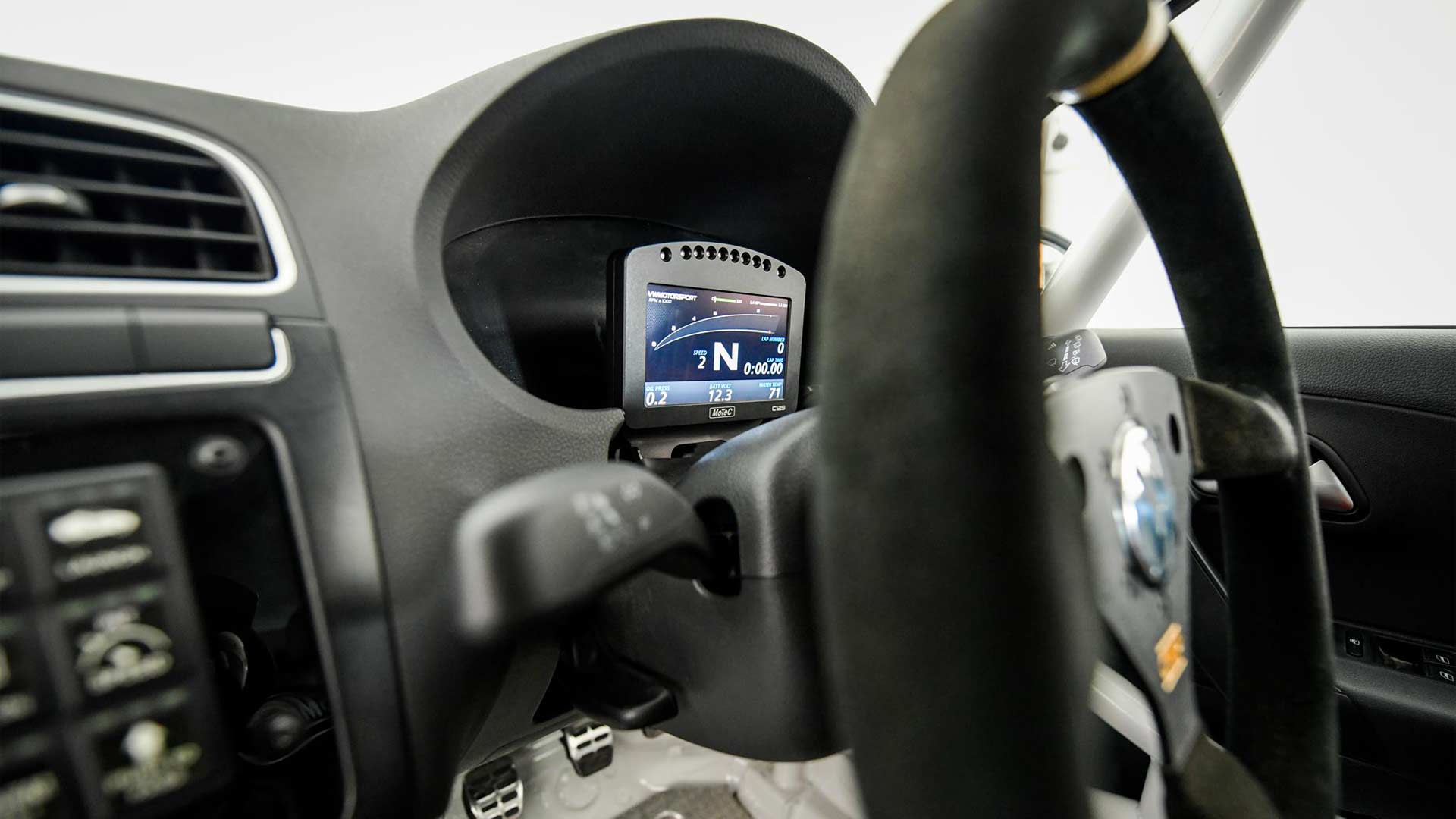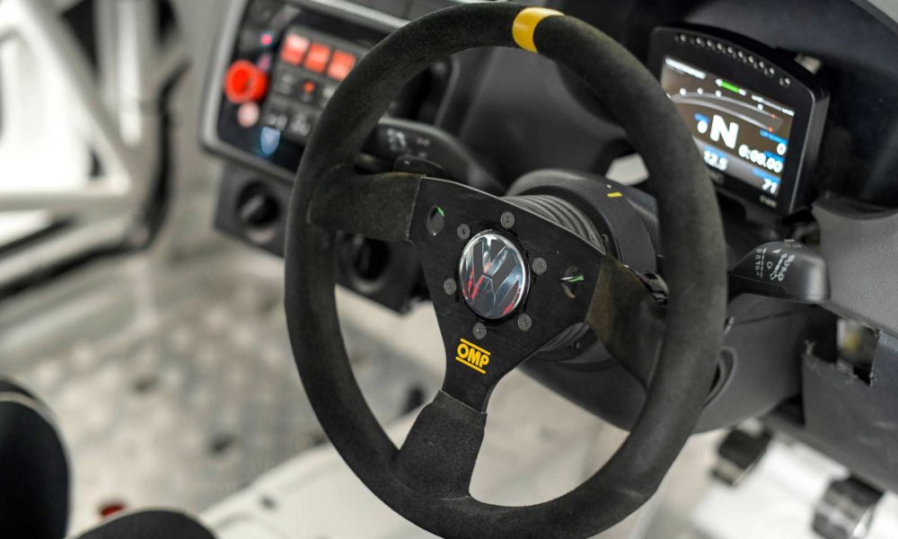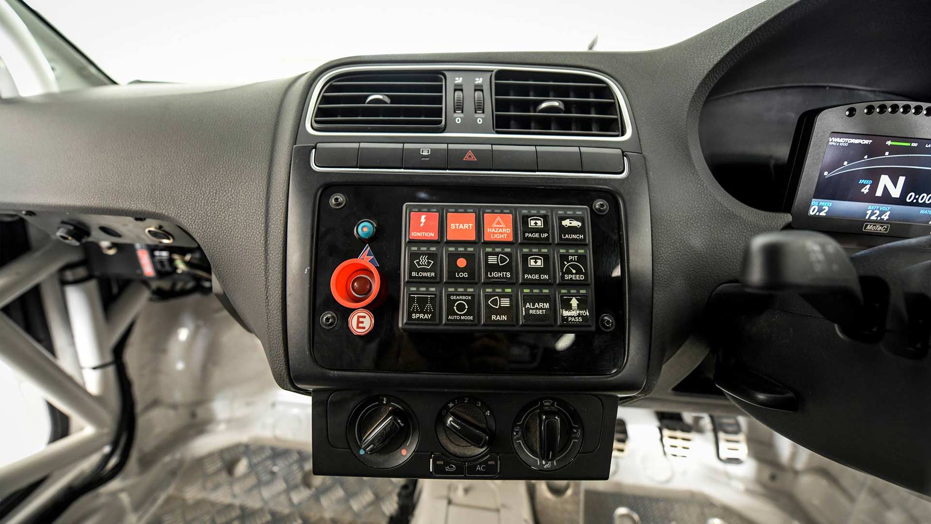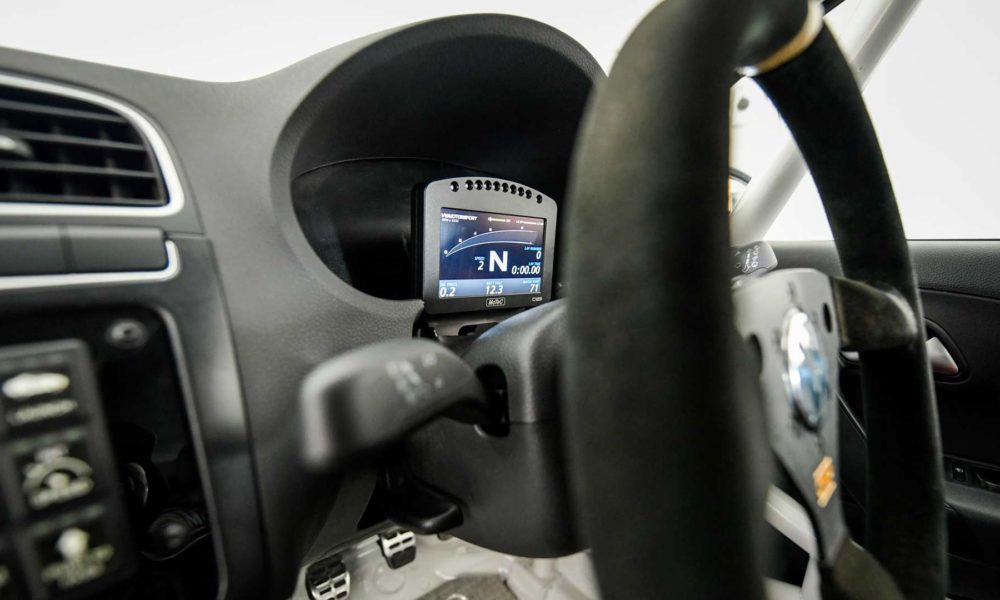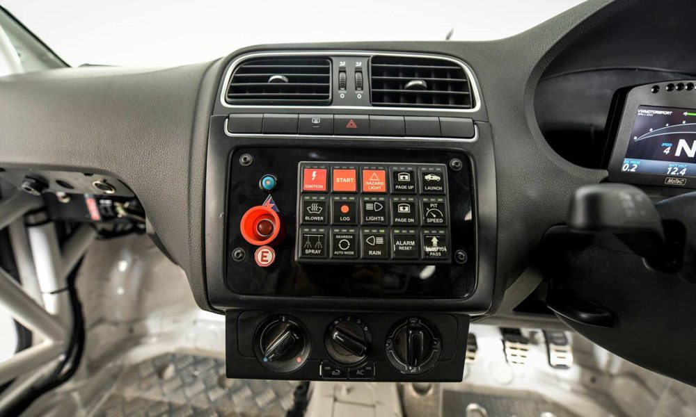 The donor car’s dashboard still forms the base for the Polo RX’s race instruments. Although the air conditioning controls have been retained, it is not clear whether the air conditioning itself has been retained.