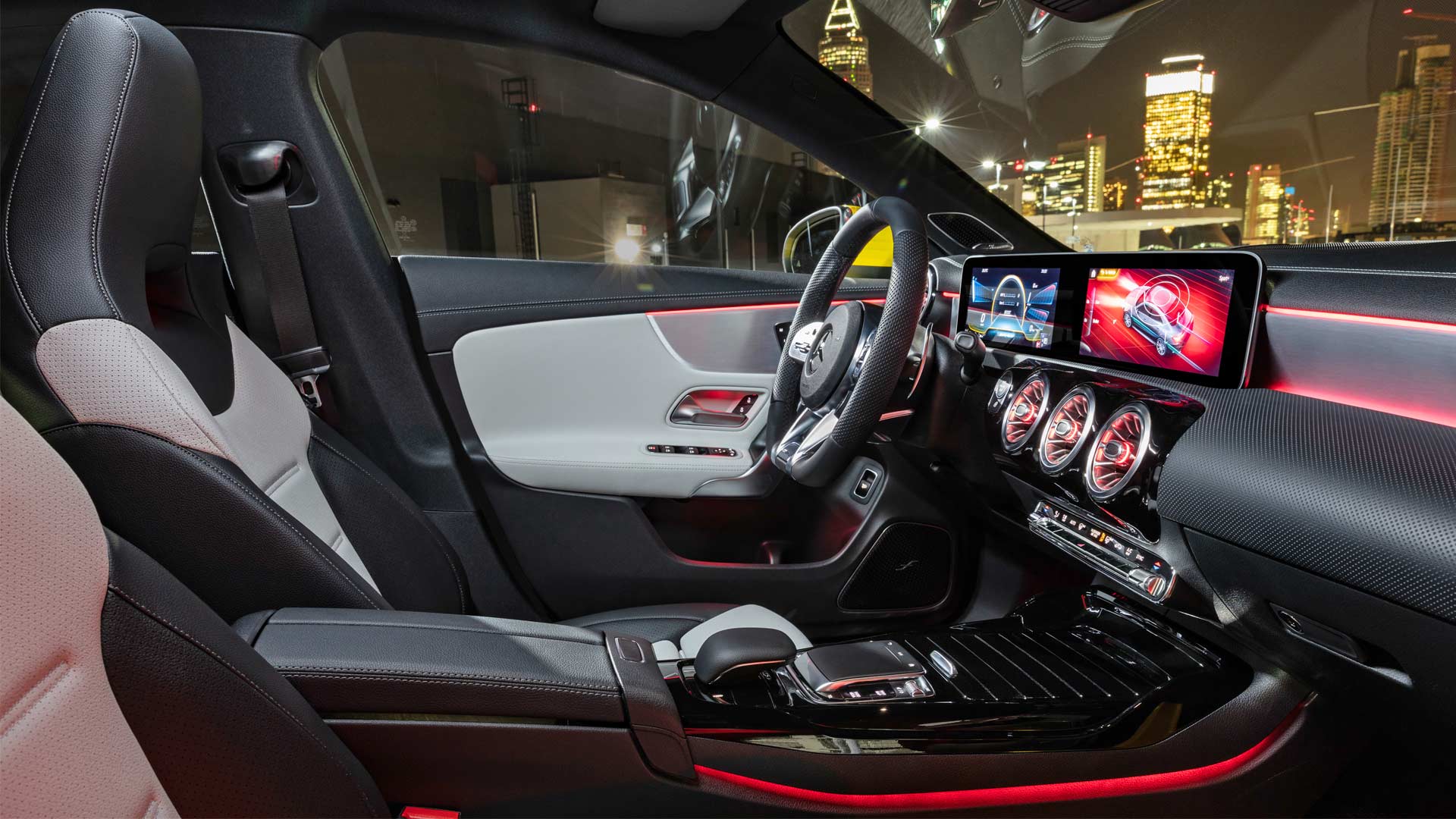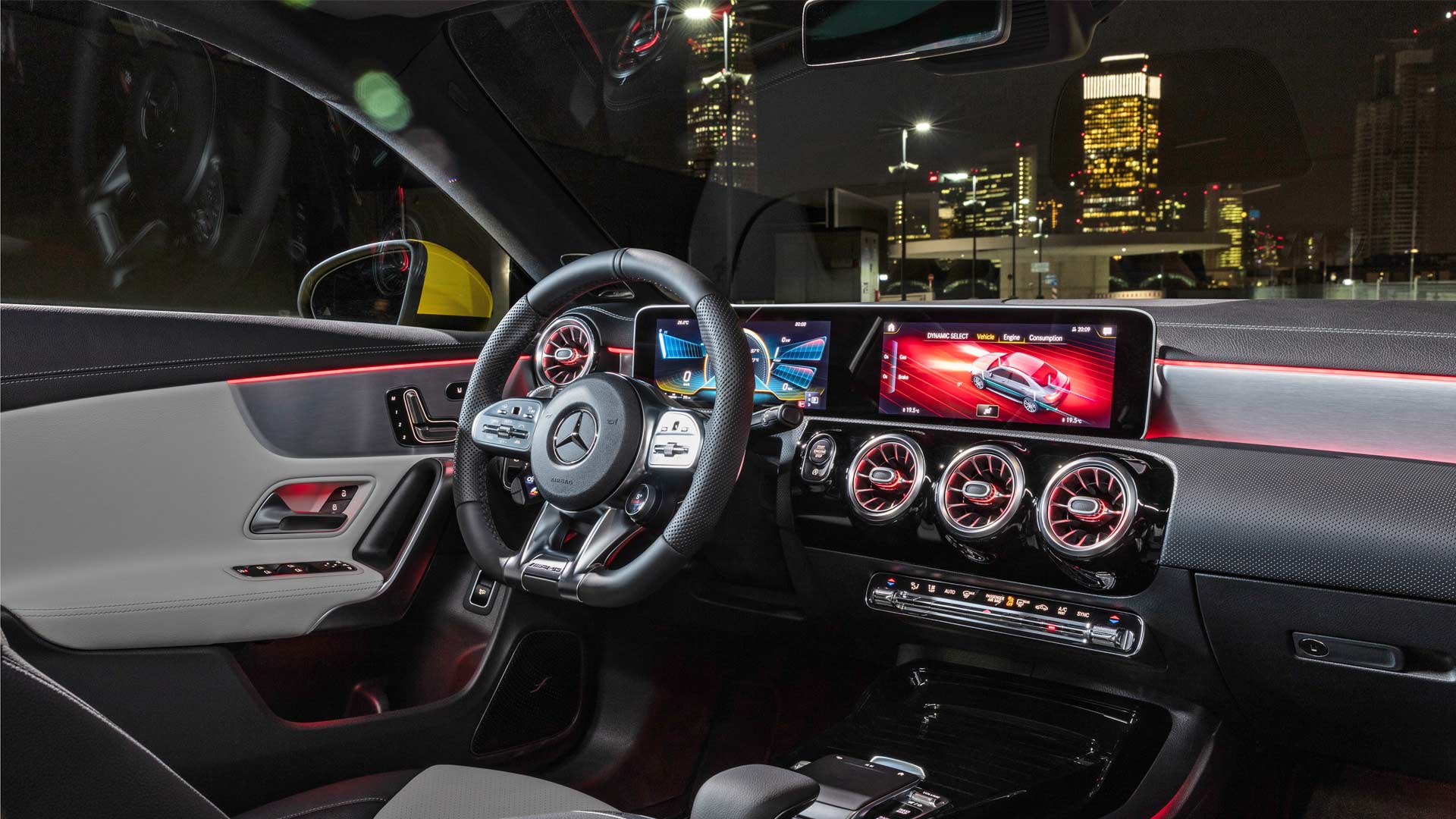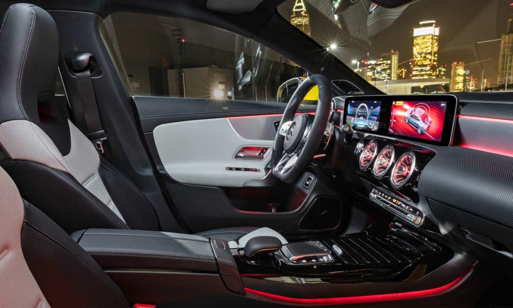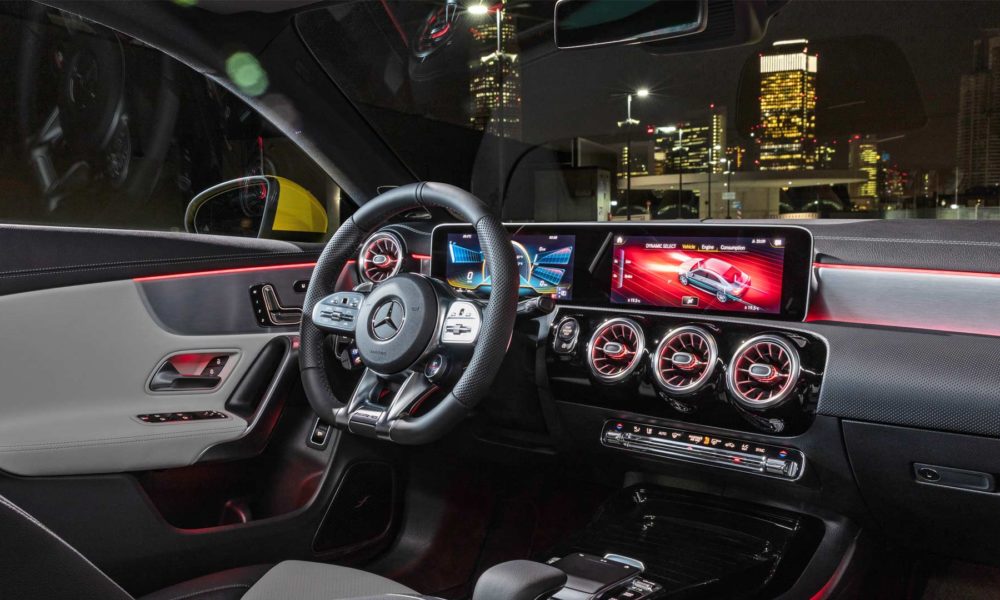 On the inside, the MBUX’s fully digital instrument cluster comes with three AMG display styles – “Classic”, “Sport” and “Supersport”. Options list includes 64 color ambient lighting, Artico man-made leather with Dinamica microfibre in black with red contrasting stitching and red seat belts or in Artico leather in black/digital grey, MBUX interior assistant that enables select infotainment functions to be operated touchlessly, head-up display, and AMG Track Pace.