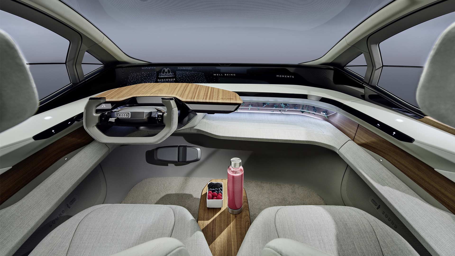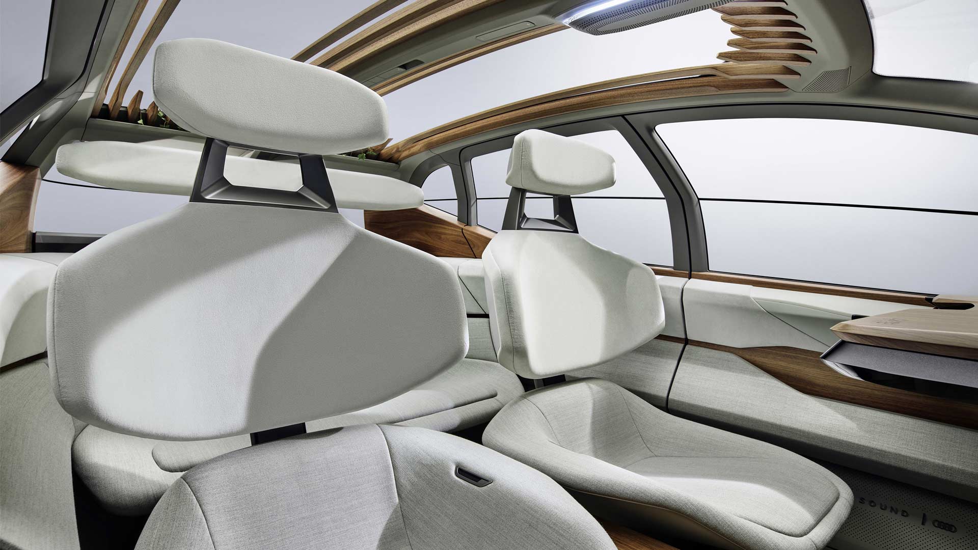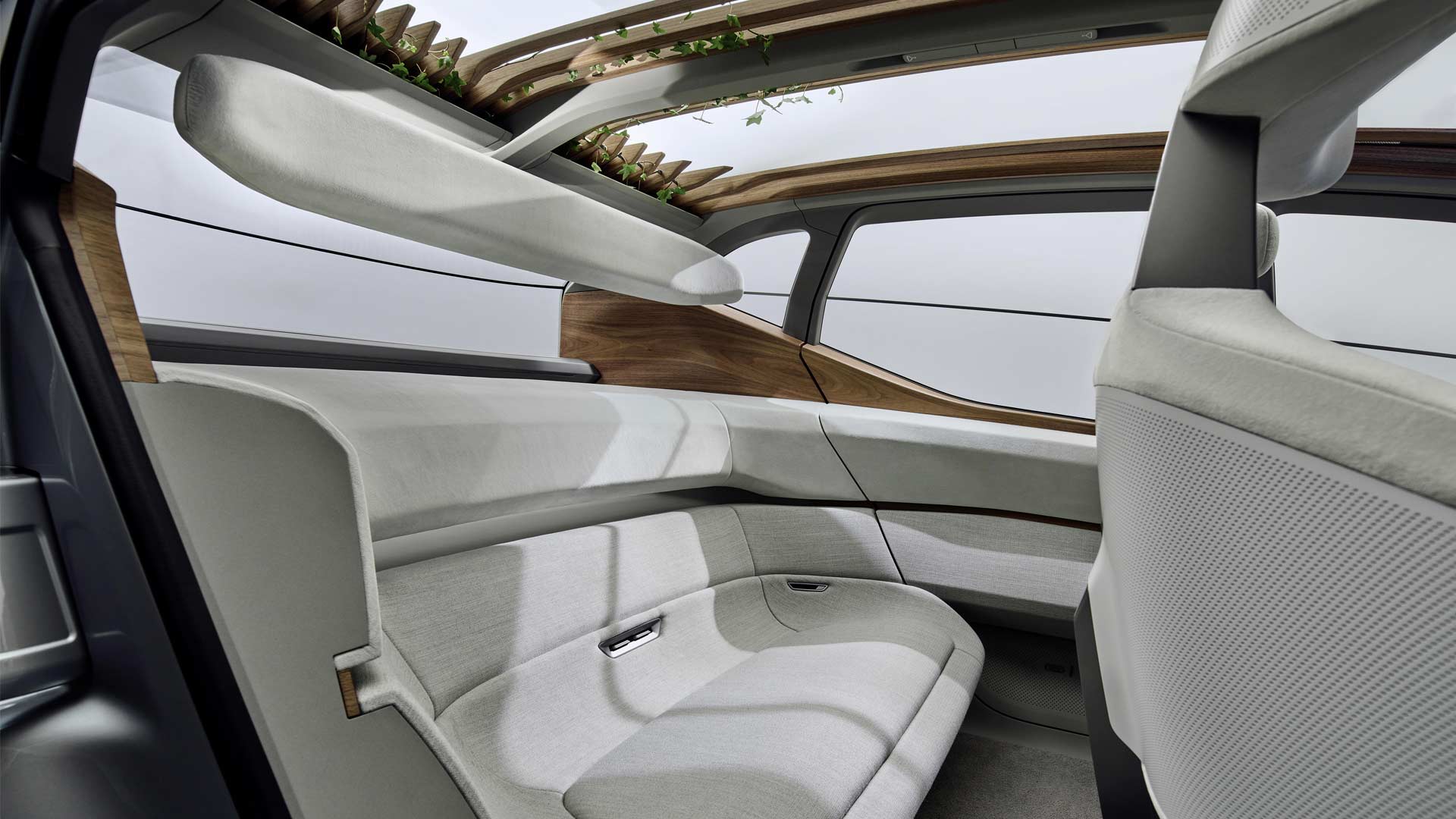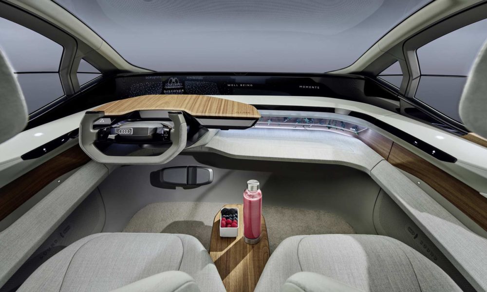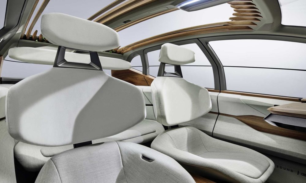 The backrests are designed as curved shells that are attached to the seat cushion only with a vertical holder. When cruising in autonomous mode, drivers can rest their feet on the supports under the dashboard, such as on an ottoman. On the rear bench, occupants can vary their seating position almost any way they like, Audi said.