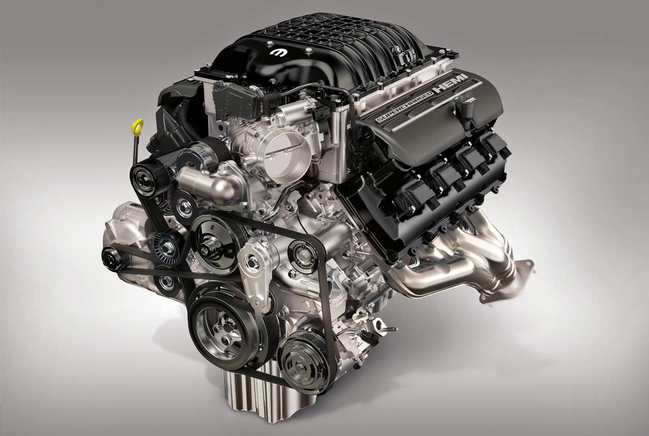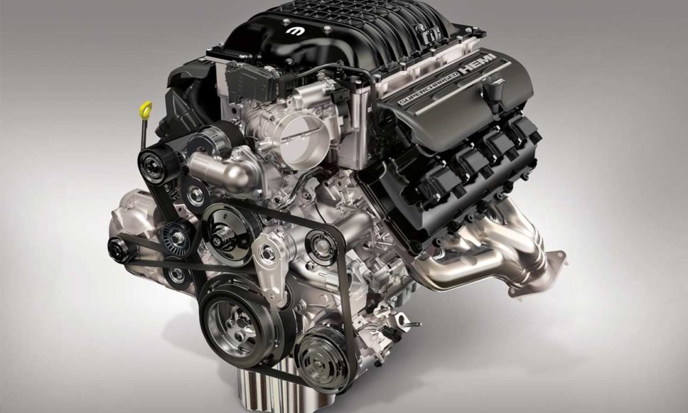 The 7.0-litre V8 Supercharged Hellephant develops 1000 hp and 950 lb.-ft. (1288 Nm) of torque. The bore and stroke is 4.125 inches and 4.0 inches, respectively. A supercharger with a high-efficiency rotor set is mounted on an all-aluminium block.