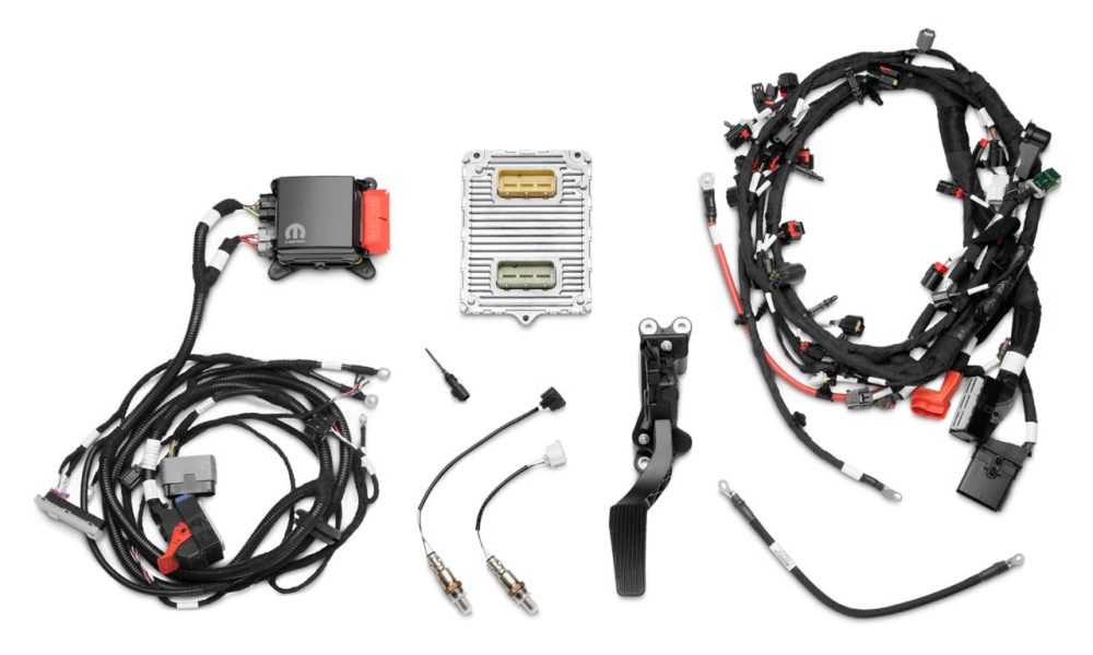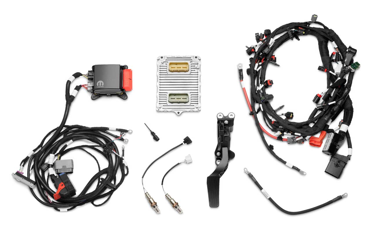 The plug-and-play kit includes a powertrain control module (PCM), power distribution center, engine wiring harness, chassis harness, accelerator pedal, ground jumper, oxygen sensors, charge air temperature sensors, fuel pump control module and CAN bus interface device.