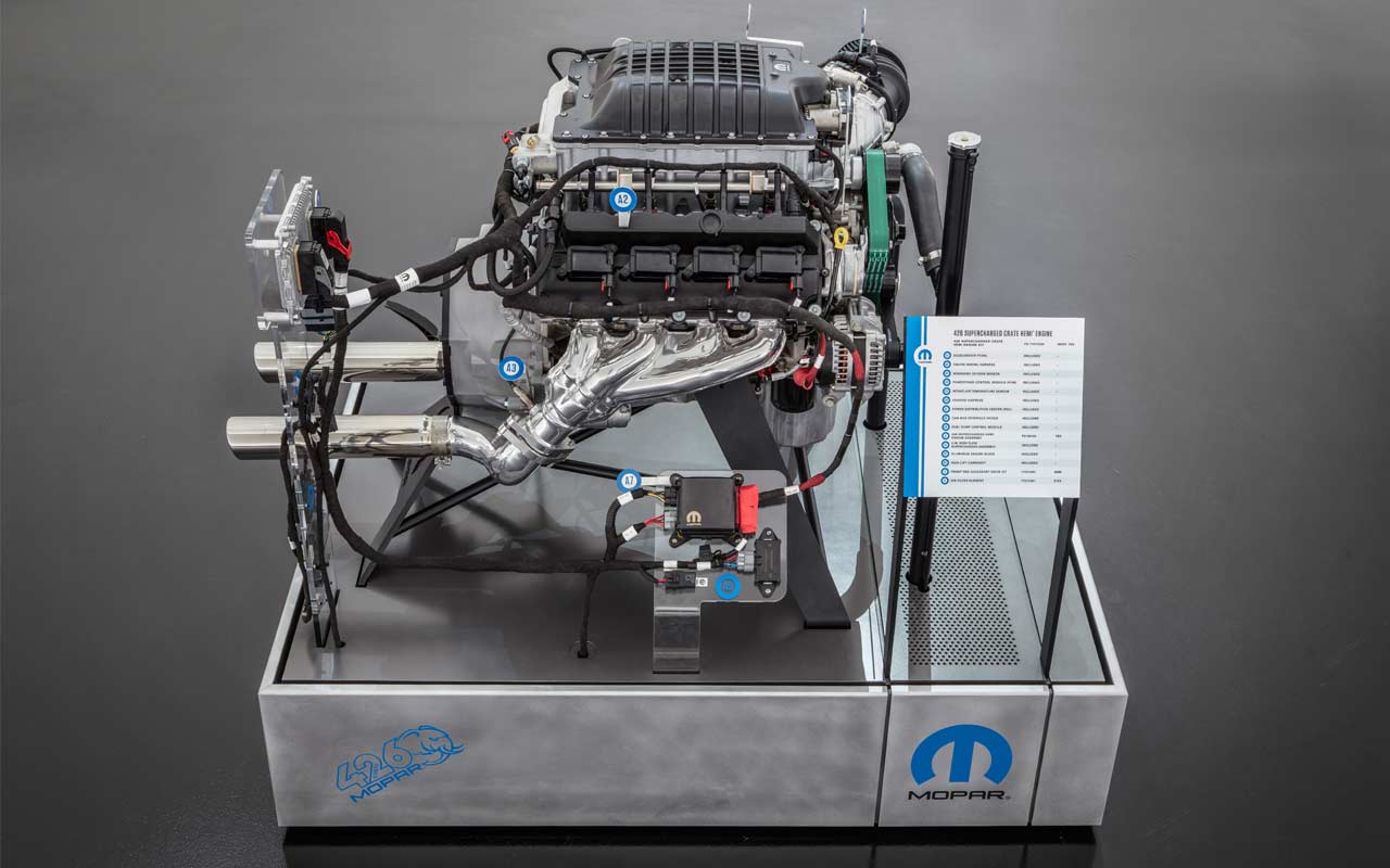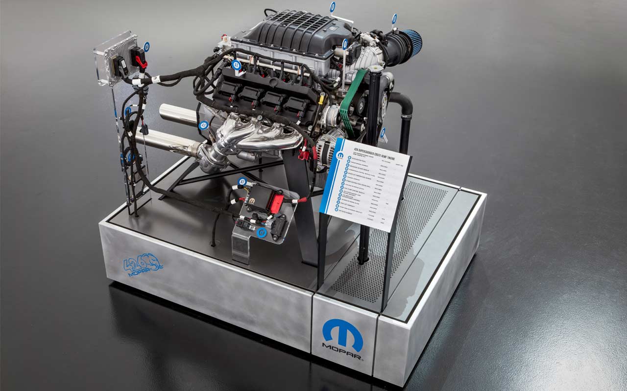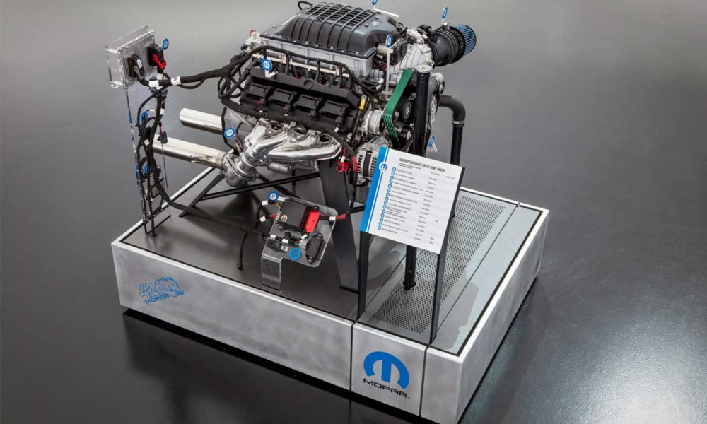 The complete engine assembly includes a water pump, flywheel, front sump oil pan, supercharger with throttle body, fuel injectors and coil packs. The engine assembly and kit are designed for installation on pre-1976 street and off-road vehicles, FCA said.