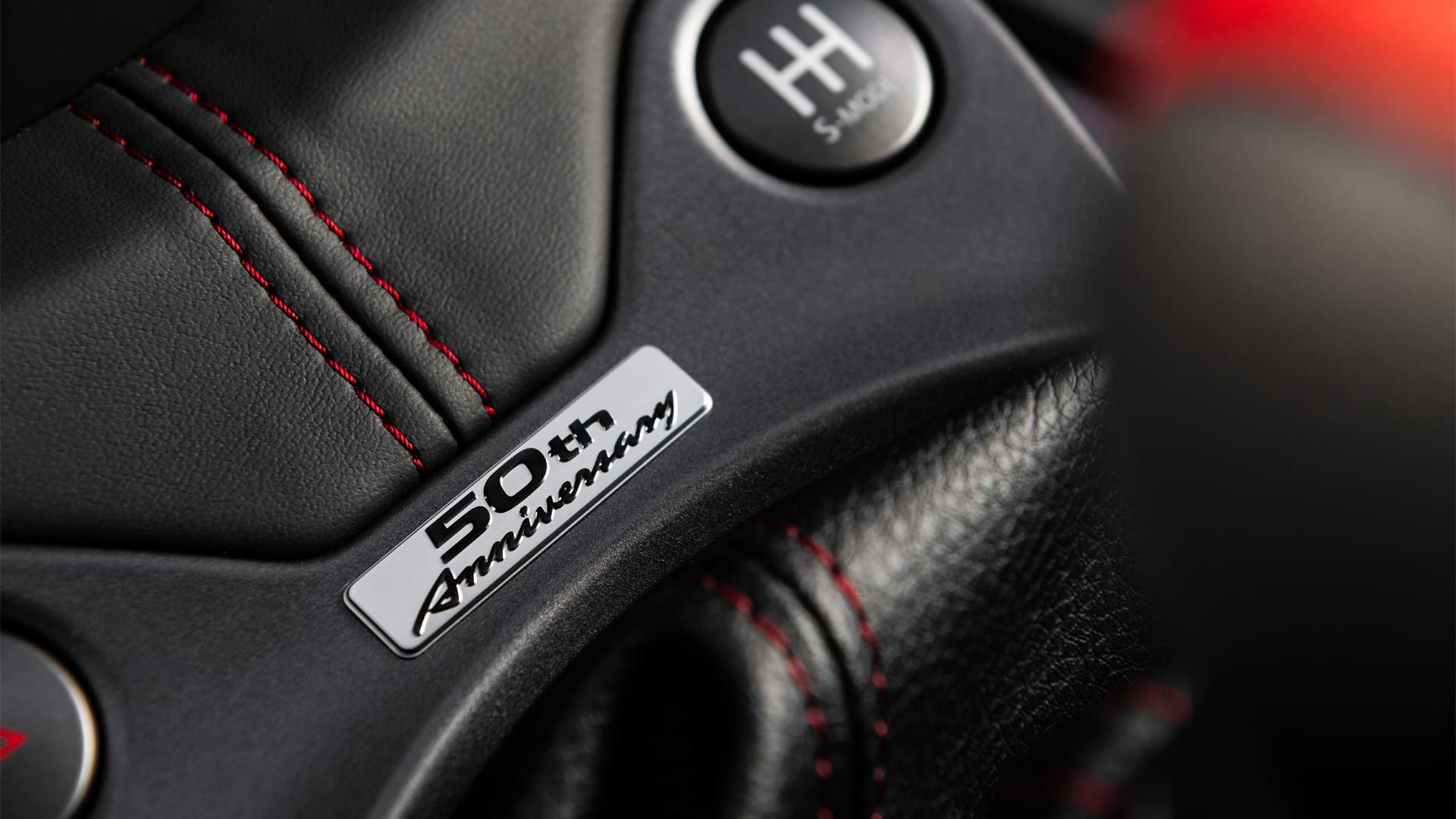 Inside, special touches include a 50th Anniversary steering wheel wrapped in Alcantara, with a center stripe. The leather and suede covered seats have unique stitching, graphics and the 50th Anniversary logo embossed into the backrests.