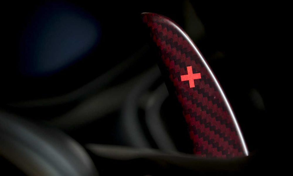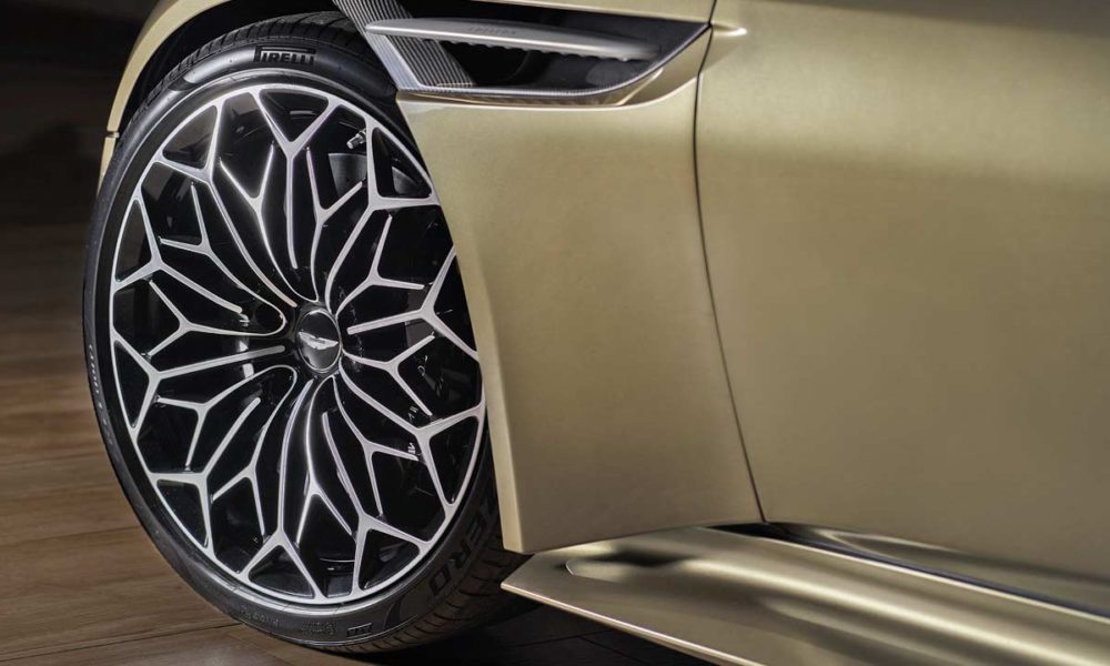 A bespoke metal grille with 6 horizontal vanes, body-colored cantrails and roof, carbon fibre splitter and Aeroblade are some of the other exterior features. A modern 21-inch interpretation of the original’s spoked wheels round off the exterior looks. The design of the diamond-turned wheels looks rather busy.