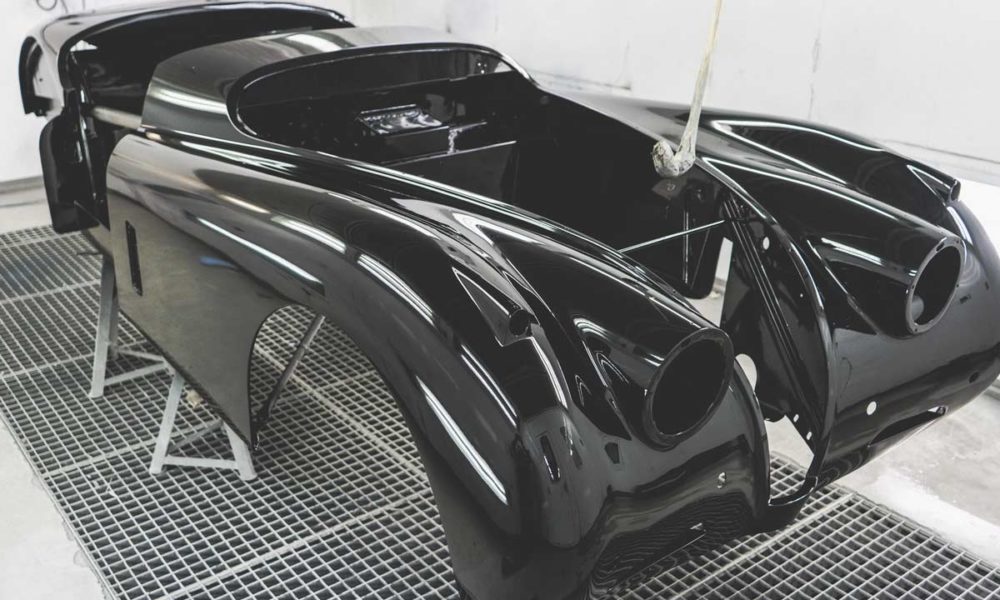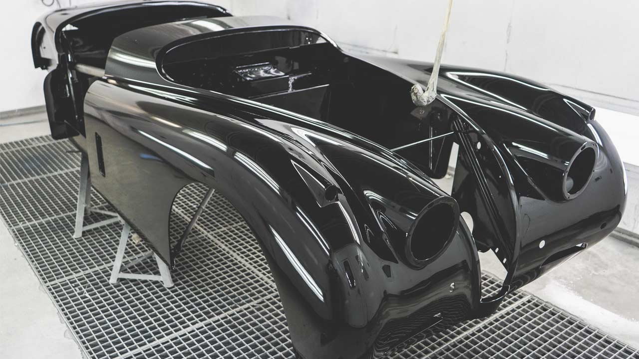 The design and finishing touches were done in close collaboration with David, who chose the color and materials at every step of the restoration process. The exterior is finished in solid black, made up of 13 litres and four coats of paint, while additional exterior features include a racing-inspired flip-top fuel cap. The original split-screen windscreen has been replaced by twin aero screens – similar to that of the XK120 Lightweight.