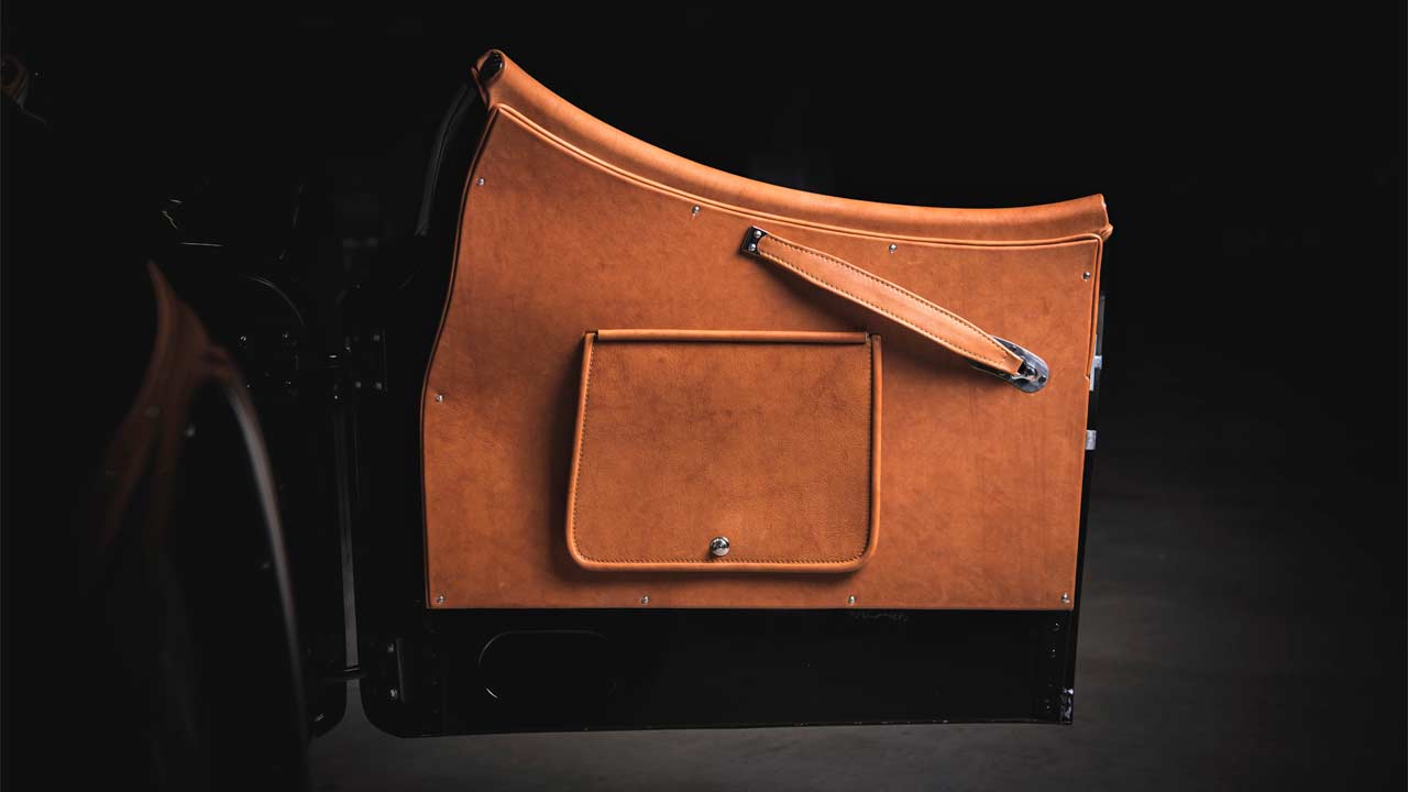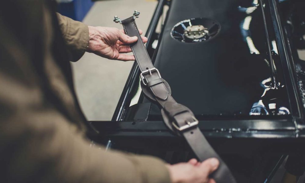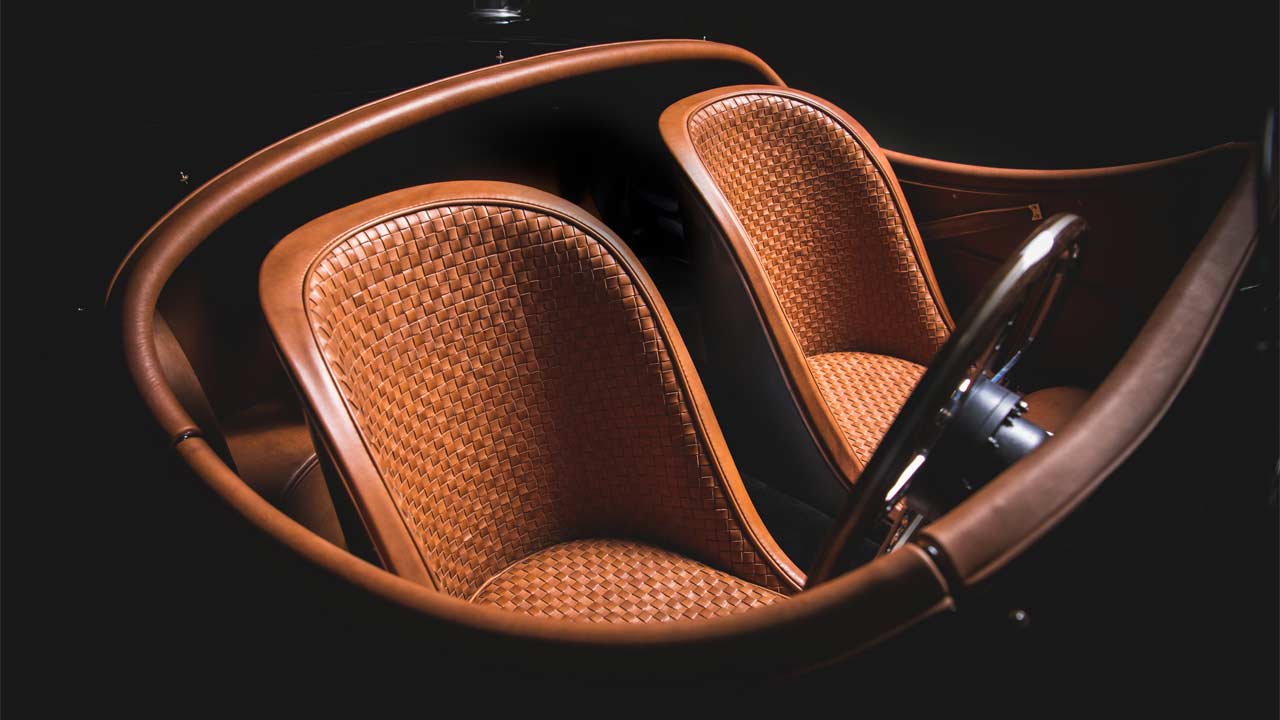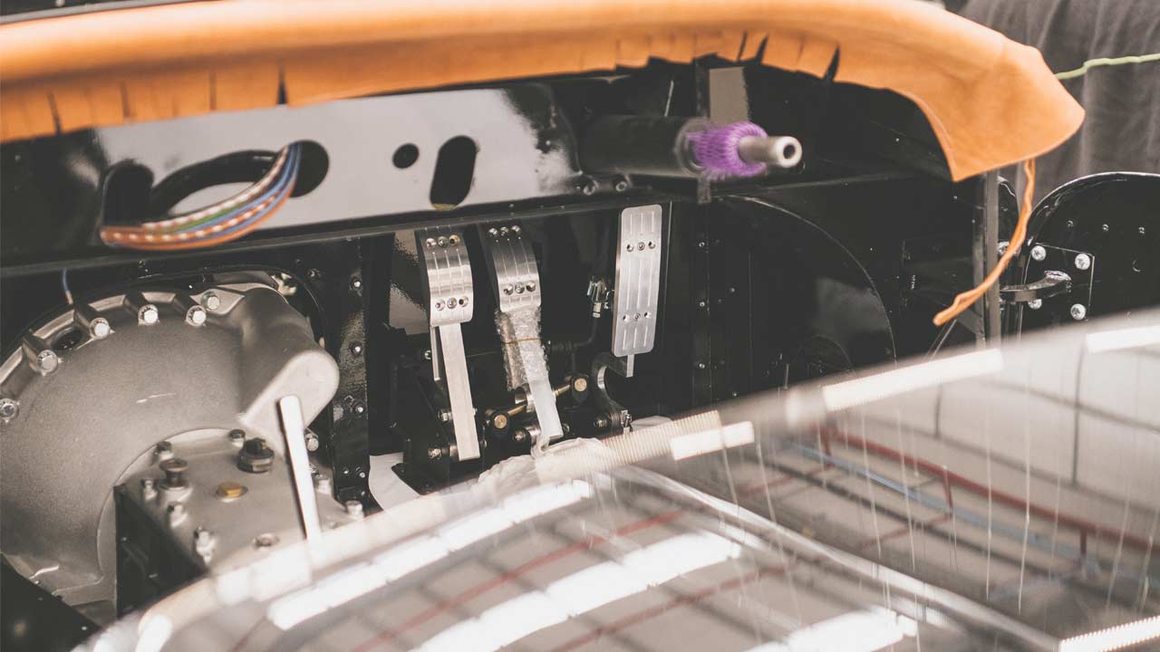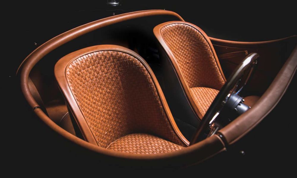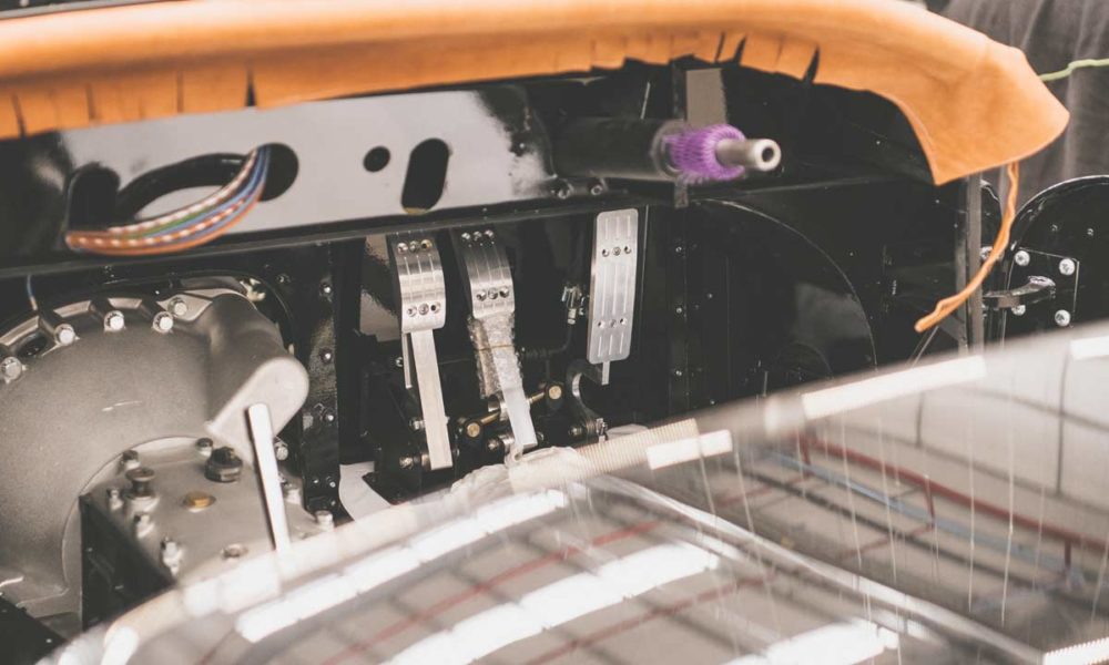 Aged Saddle tan leather dominate the interiors, with seats in a bespoke lattice design. While two batteries would usually sit behind the driver’s seat, this car has a single battery behind the passenger seat to free up space behind the driver, to enhance comfort for 6 ft 2 inch tall David. The custom 15-inch steering wheel is also smaller than normal to help with more legroom.