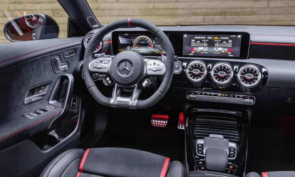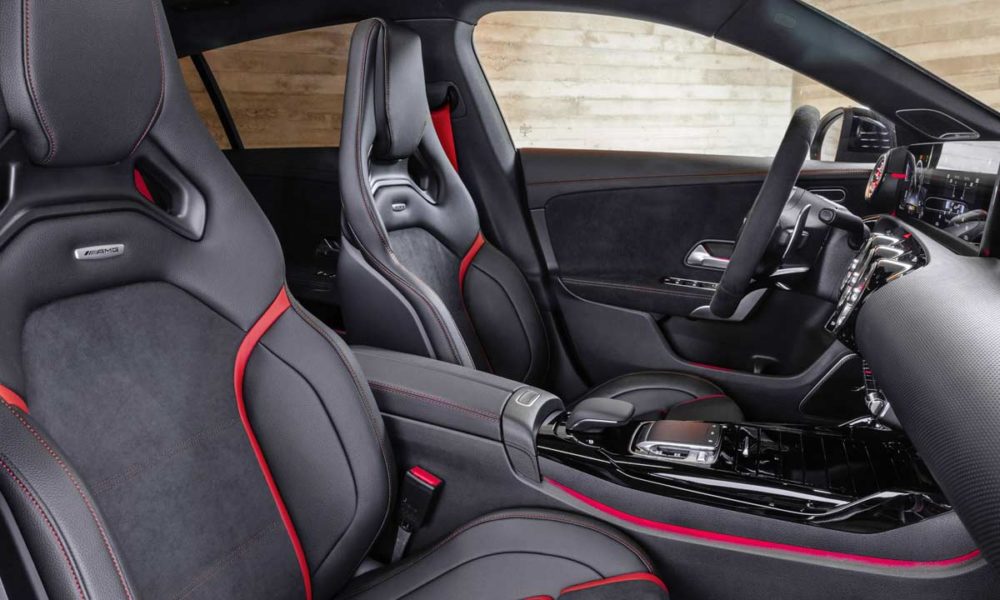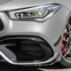 Typical of an AMG variant these days, the CLA 45 gets AMG-specific radiator grille with vertical slats and a more aggressive bumper design with large air intakes and canards. The rear end is characterized by two round twin tailpipes (82 mm diameter); the S-models are distinguished by their larger, 90 mm exhaust tailpipes. There’s also a diffuser with four vertical fins for enhanced aerodynamic performance. This particular example rides on 19-inch wheels shod with 255/35 rubber.