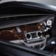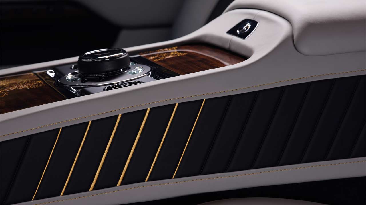The dashboard’s Smoked Eucalyptus wood is vacuum metalized in gold before being inlaid with silver and copper, to depict that night time flight; the scene extends to the centre console. Below, the brass-stitched quilted sides of the centre tunnel provide a direct nod to the V12 engined Vickers Vimy.