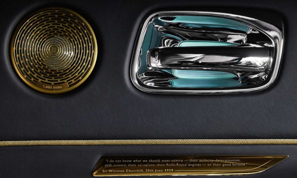The interiors are finished in Selby Grey and black leather, and brass accents. Brass speaker covers depict the estimated flight distance of 1,880 miles (3,025 km) and ‘RR’ monograms are embroidered in brass coloured thread onto headrests. A flash of brass complements the navigator door panniers, whilst the door of the driver includes a brass plaque with Churchill’s quote commending the duo’s remarkable achievements.