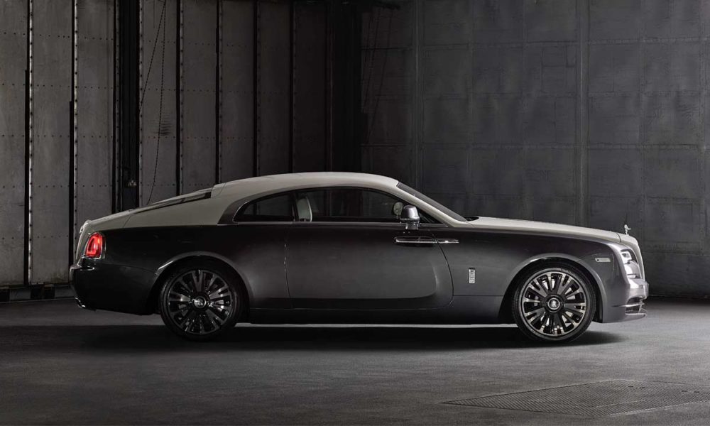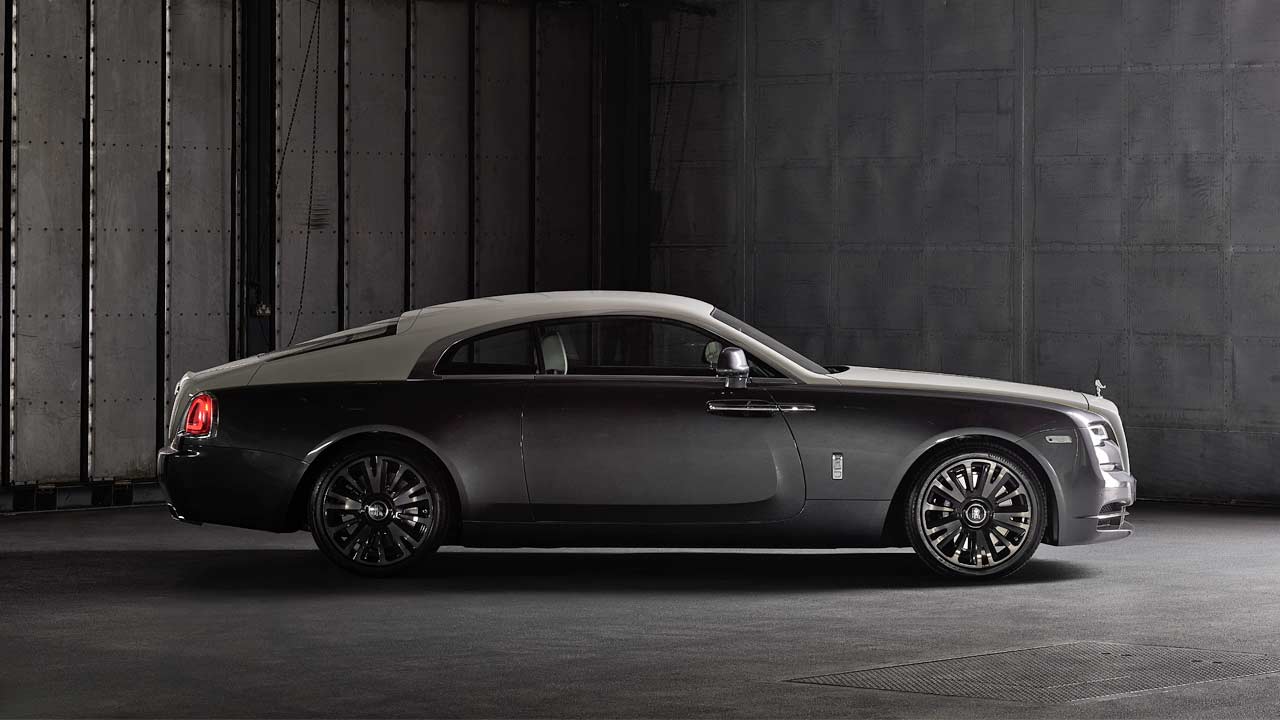 This special Wraith doesn’t have that engine, obviously. What it gets, however, is an exterior swathed in Gunmetal with a Selby Grey upper two-tone, the colours are separated by a brass feature line. The black grille vanes draw immediate reference to the Eagle VIII engine cowling on the Vickers Vimy aircraft, the wheels are part polished with a translucent shadow finish.