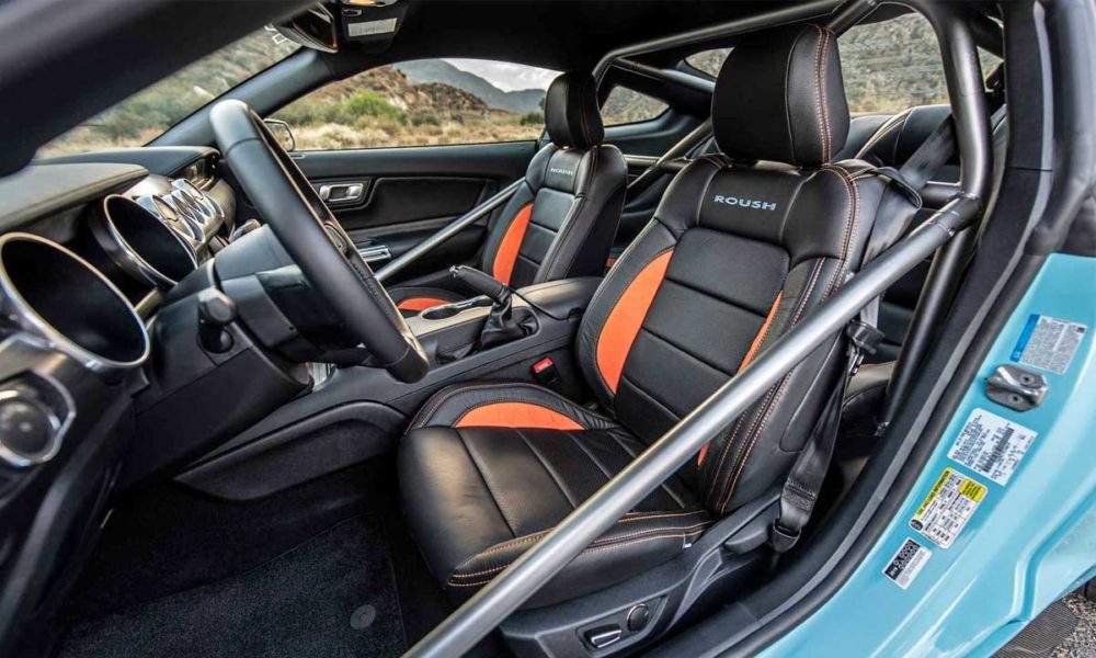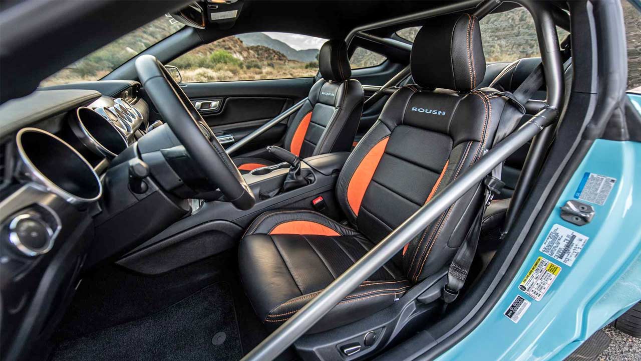The Stage 3 Mustang’s Sport Interior Package has been upgraded with color-matched orange accents and a unique Roush plaque.