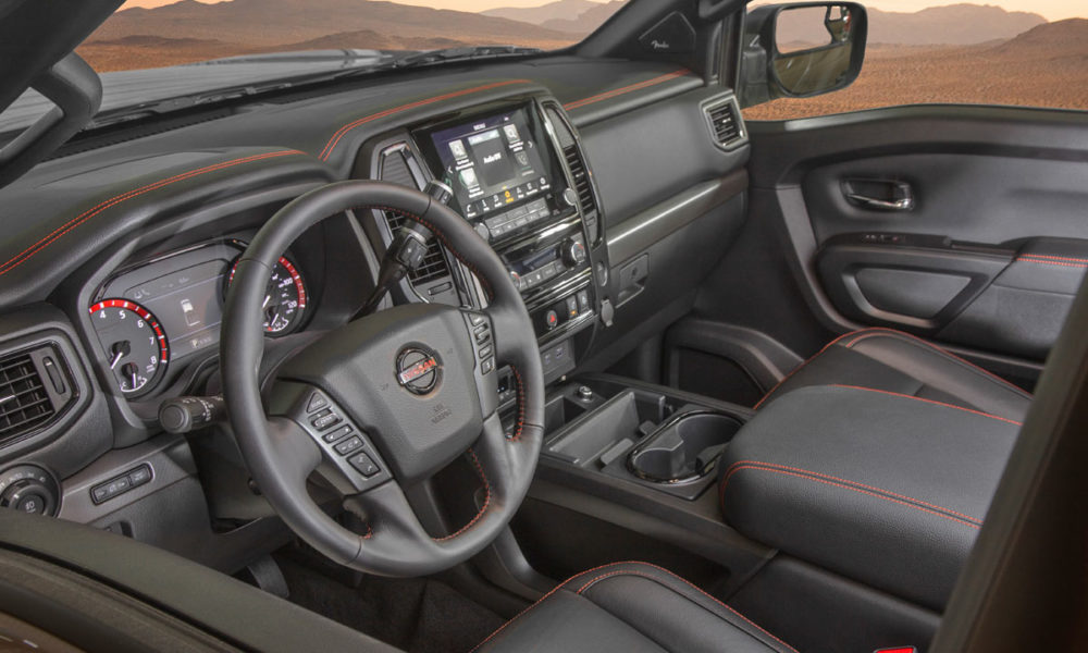 Speaking of which, the redesign was led by a team at Nissan Design America (NDA) in La Jolla, California. The subtle design changes include redesigned LED headlights with “double boomerang” LED DRLs, which according to Nissan, are among the largest ever produced by the company and consists of four LED boards putting out 800 lumens each. They are standard on PRO-4X, SL and Platinum Reserve grades. As for the new headlights, they apparently produce around 120 percent more light in the low beam than the previous Titan. There are three unique grille designs to differentiate between the grades.