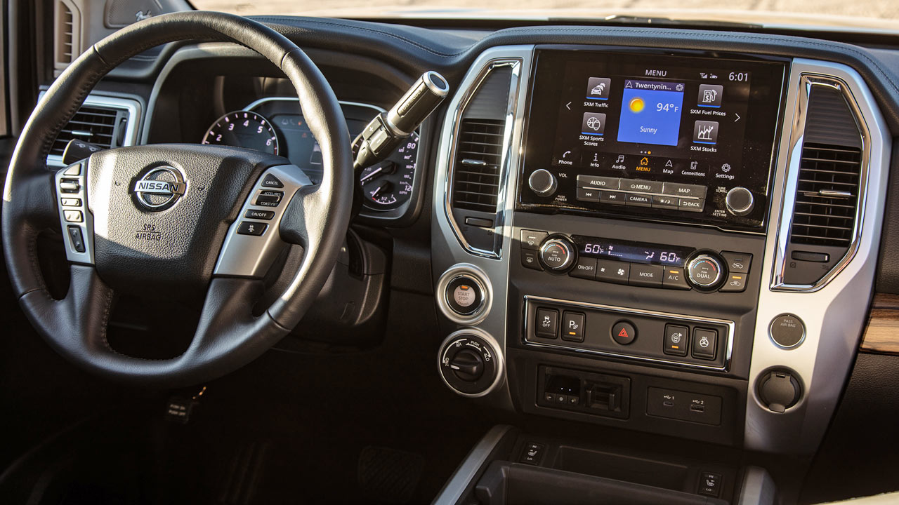 The 2020 Titan features an enhanced Off Road Gauge that displays the vehicle’s tire angle, relative pitch and roll angles. Without using a gyroscope, a new method was developed to calculate the vehicle’s orientation using accelerometer data and calculating the vehicle’s G-force, Nissan said. Nissan expects the new gauge to be the most accurate (versus competition) at higher speeds.