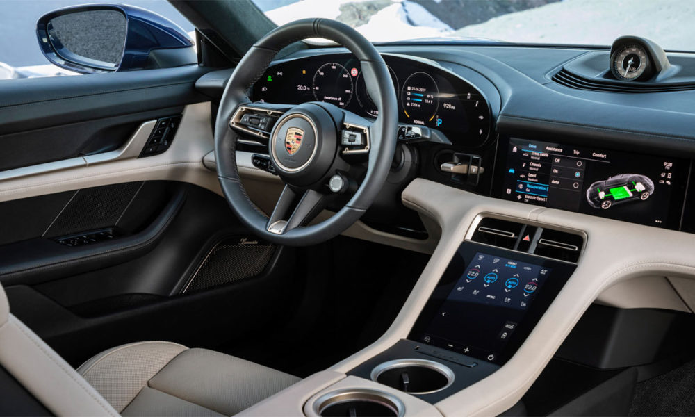 The production interiors of the Taycan were revealed just over a week ago. More about the interiors here. Features include a curved instrument cluster, 10.9-inch infotainment system, and 8.4-inch touch panel on the centre console. Options include a passenger display and four-zone climate control.