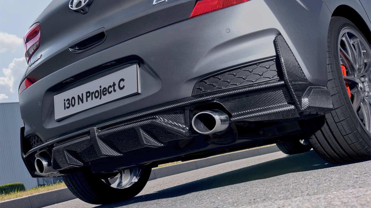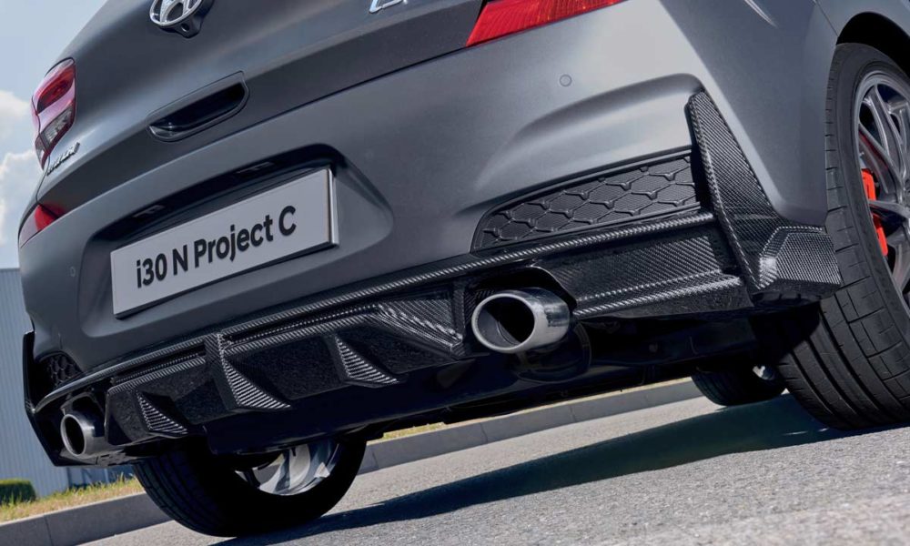 The bonnet (-7.2 kg), both side sills (-499 grams each), front splitter (+240 grams), newly designed rear diffuser (-386 grams), and 19-inch OZ racing wheels (-22 kg) have all resulted in shaving off the weight. The Project C’s kerb weight is 1,395 kg (vs 1,429 – 1,509 kg of 275 PS i30 N).