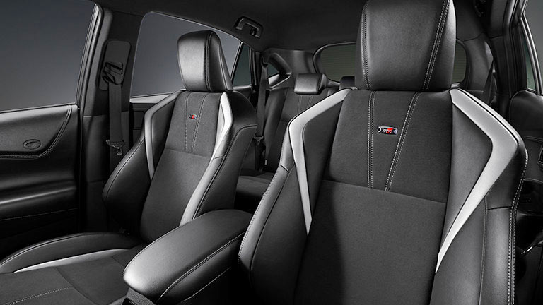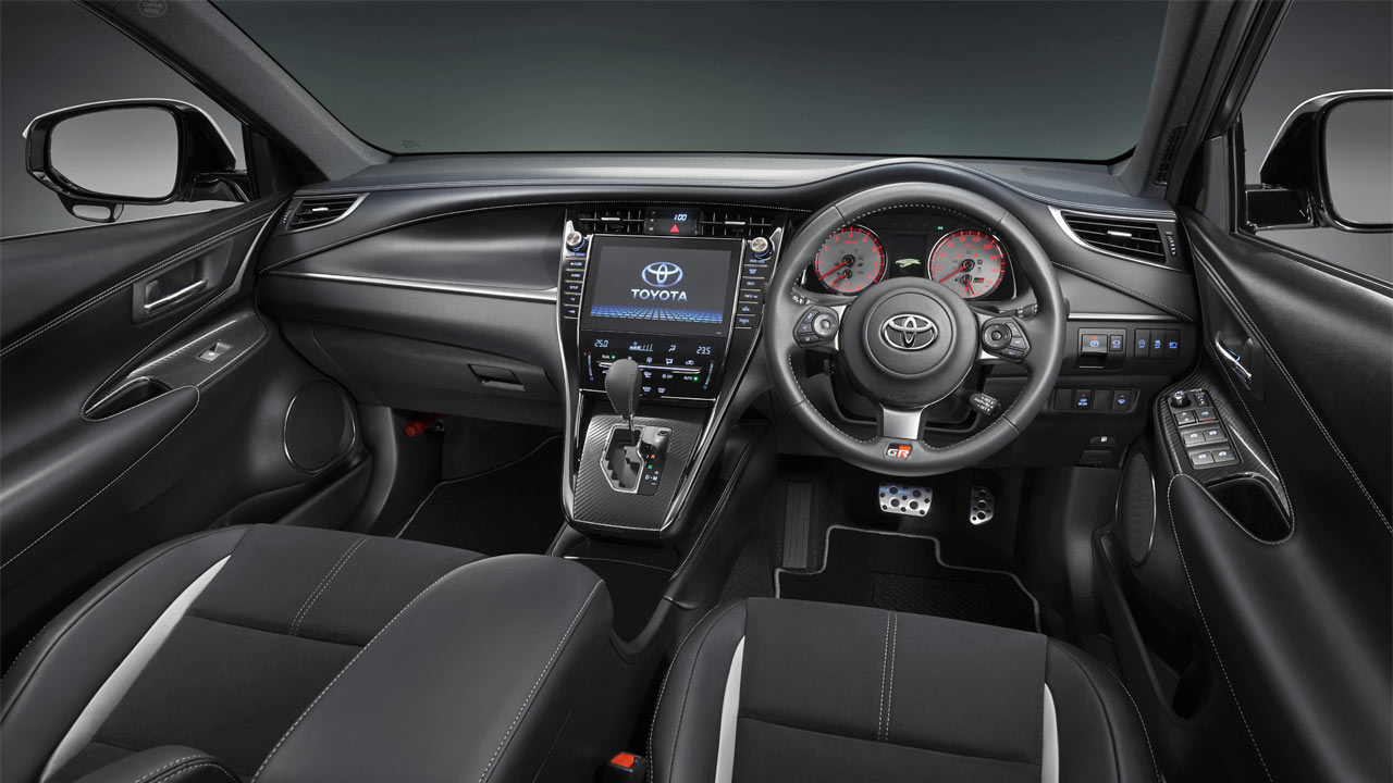 Besides the black design elements and sporty bumpers, there are three 19-inch 5-twin spoke wheel choices including one with red pinstripes. The white calipers get a GR logo. It’s not all visual though, the suspension gets an exclusive tuning and the vehicle sits about 30 mm lower than the regular Harrier. The gasoline variants get a tuned exhaust note as well.