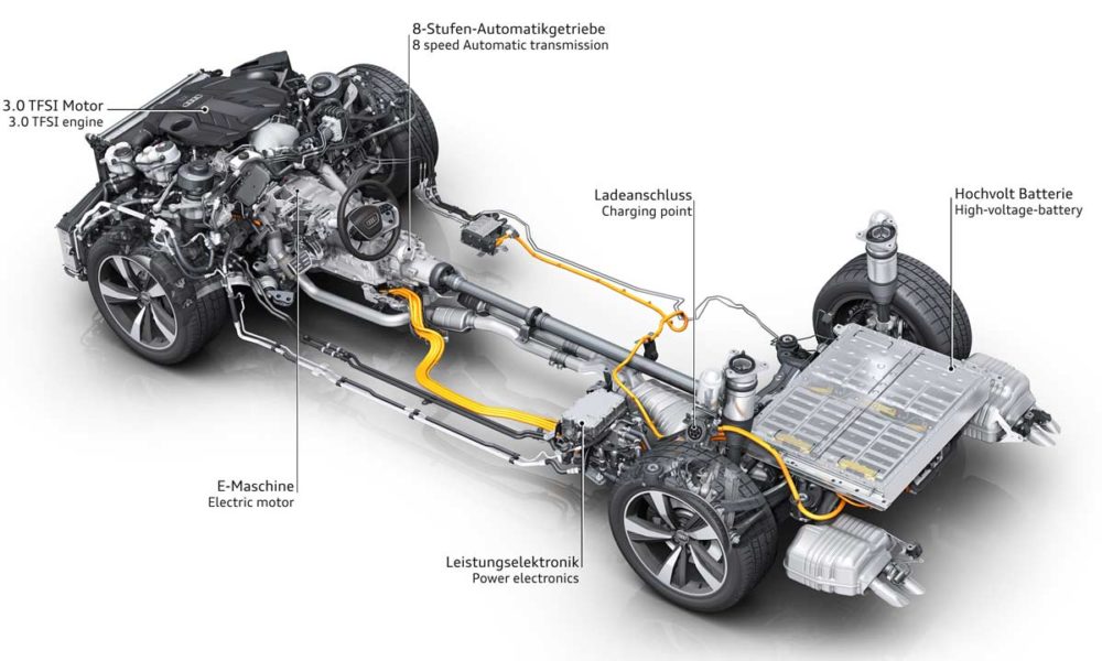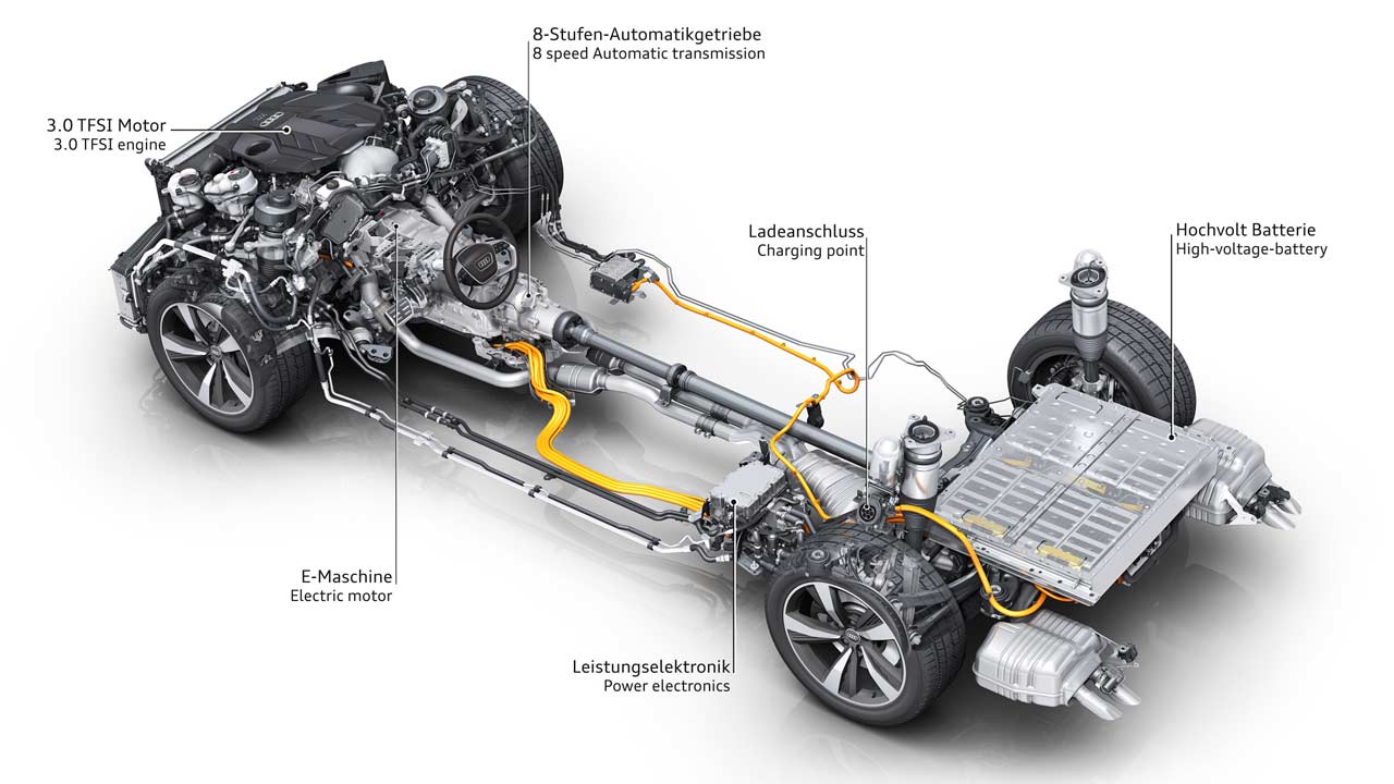 Jumping straight to the business end of the story, a 3.0L TFSI V6 petrol engine is combined with an electric motor. As we can see in the 3D rendering here, it is integrated together with the clutch in the 8-gear tiptronic transmission, which transmits the power to all four wheels via the quattro permanent AWD system.