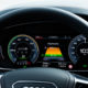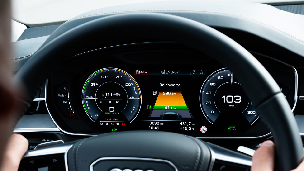 By default, the car starts in EV mode; the combustion engine is engaged only when the driver depresses the accelerator pedal beyond a certain limit. The Hybrid mode offers two sub modes: Auto and Hold. In Auto mode, the predictive operating strategy is activated automatically when route guidance is started in the MMI navigation plus (standard equipment). In Hold mode, the charge state of the battery is kept at the current level to be used later, for driving in urban areas for example.
