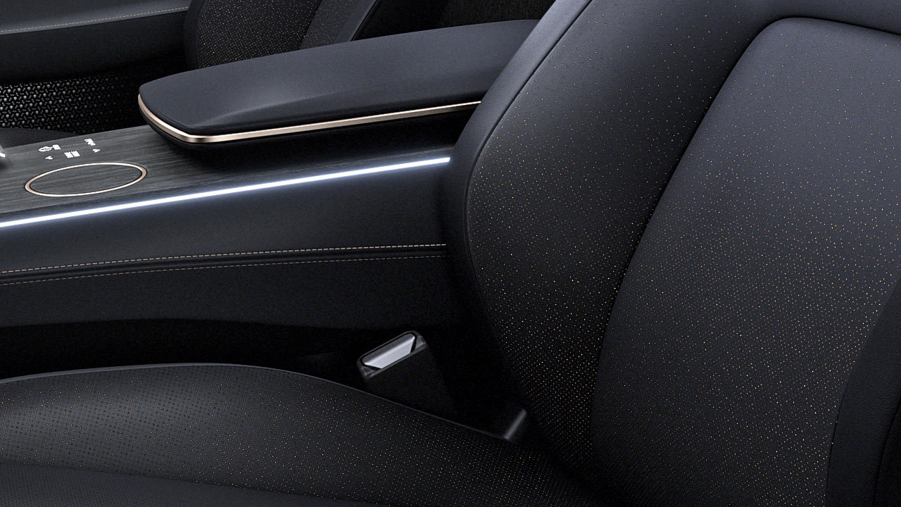 The clean design theme has been carried over to the interiors with a minimalistic dashboard. Physical buttons have been replaced with haptic touch controls that come to life with a glow. When the car is turned off, they disappear into the surface. The only physical controls are the start button, a single knob to operate the 12.3-inch display, and the climate controls.