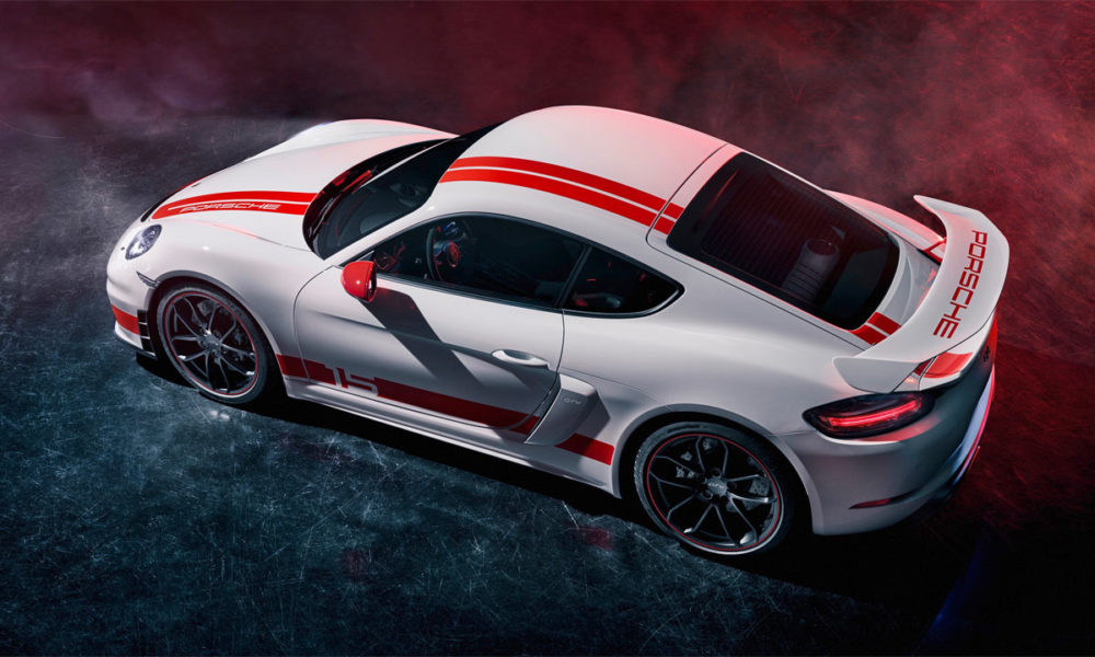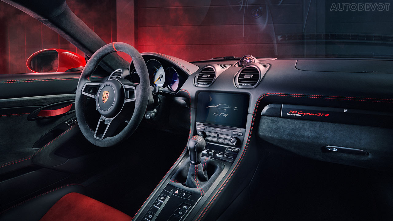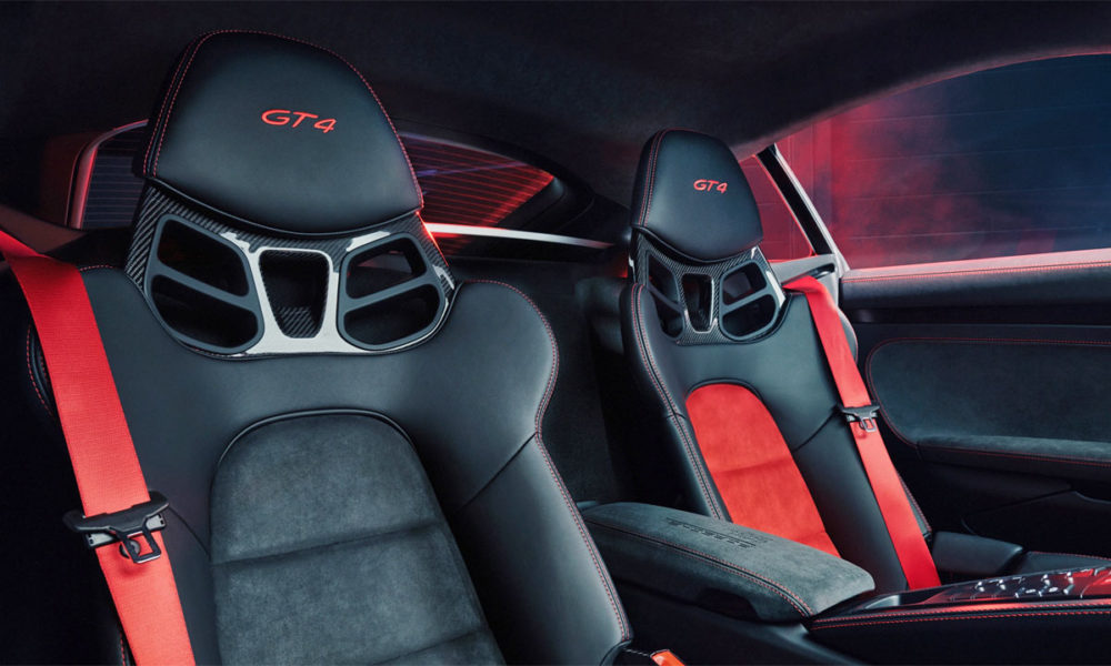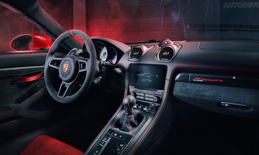 As for the car itself, the 718 Cayman GT4 Sports Cup Edition will be offered in Black and White exterior colors with red highlights for a distinctive contrast. The sides of the car get a thick red stripe with the number “15”, while the top of the car gets double stripe with a Porsche wordmark on the bonnet. The rear wing too gets a Porsche wordmark and the wing mounts are painted in Guards Red.