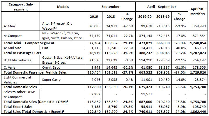 Maruti Suzuki India Limited (MSIL) sold a total of 122,640 units in September 2019, registering a decline of 24.4 percent compared to 162,290 units in the same period last year. The aforementioned total units include 112,500 units in the domestic market, 2,952 units of domestic OEM sales and 7,188 units of exports.