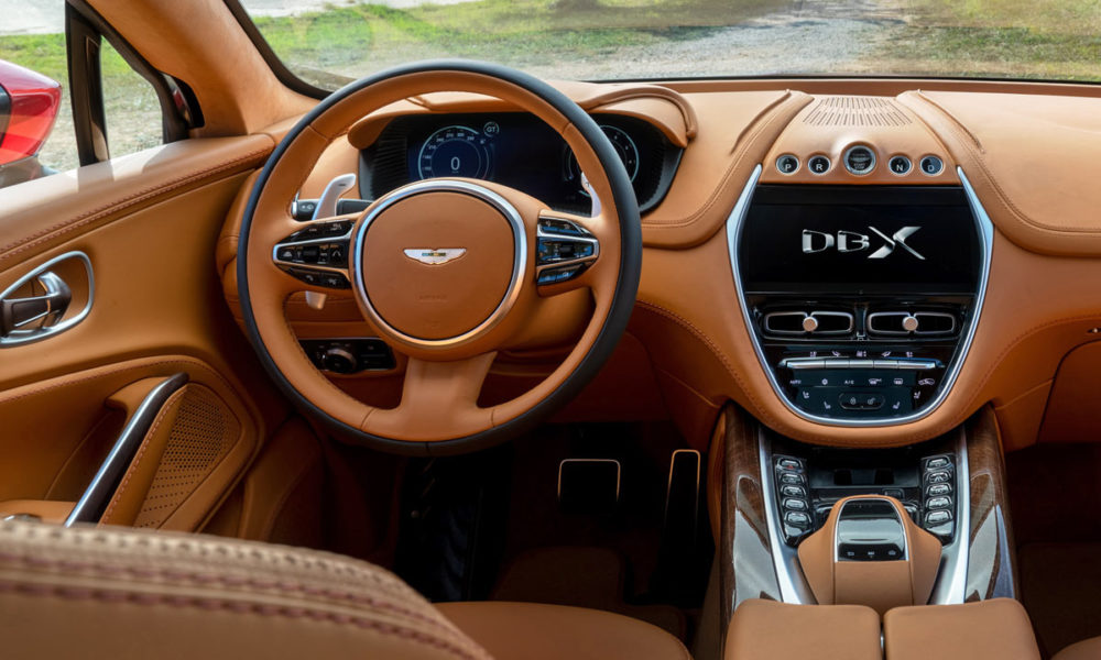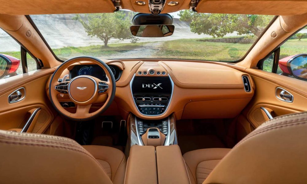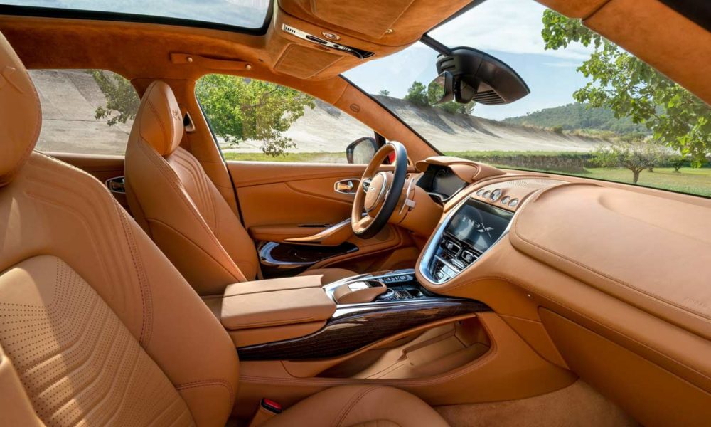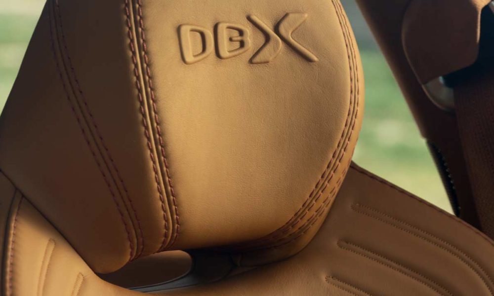 Options list includes 16-way electric front seats, seat ventilation for front & rear, heated steering wheel, contrast stitching, and several veneer options. Leather embossing of Aston Martin wings or DBX logo is also an option. Download the DBX spec sheet here.
