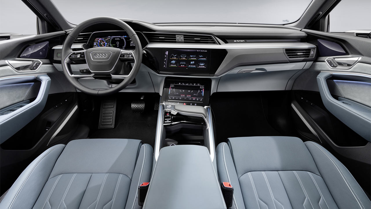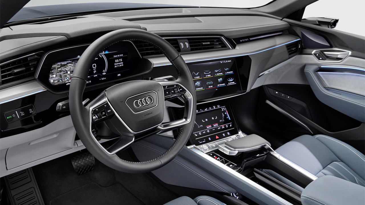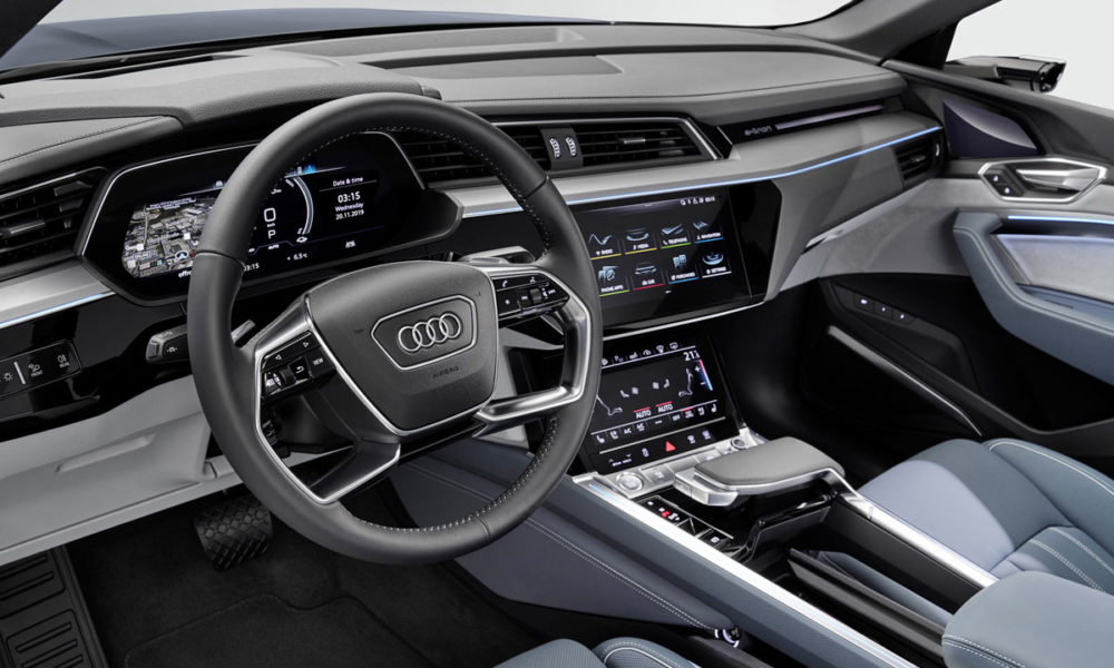 Naturally, the interior of the e-tron Sportback looks pretty much the same as its sister model. Technologies include OLED displays for the virtual exterior mirrors, 12.3-inch Audi virtual cockpit, MMI Navigation plus, Car-to-X services, and the optional Bang & Olufsen Premium 3D Sound System.
