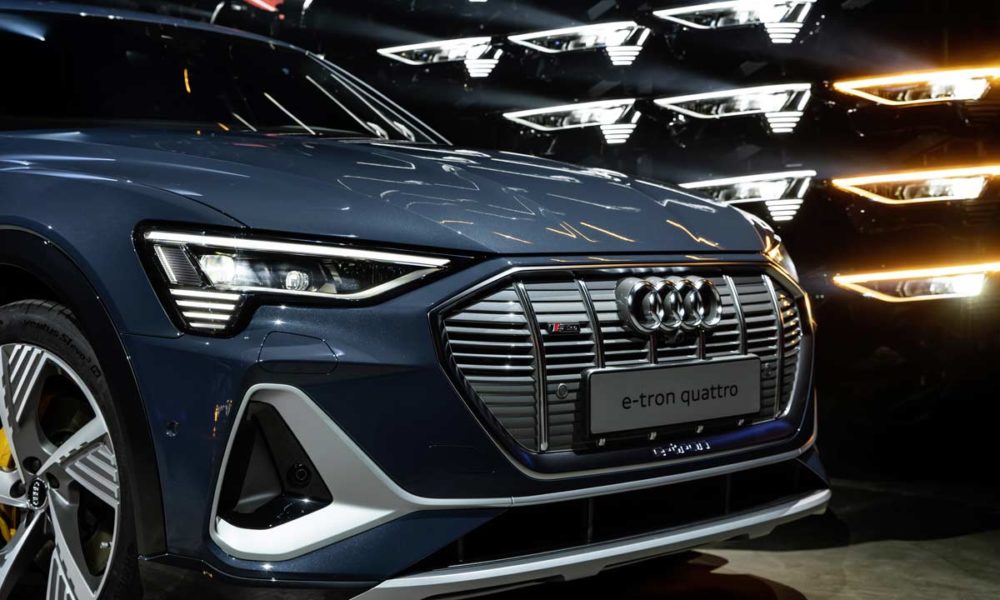 The singleframe grille with its vertical struts is finished in a light platinum gray—a specific identifying feature of the e-tron models. A total of 13 paint finishes are available for the Coupe-SUV, including a new plasma blue metallic, which is exclusive to the e-tron Sportback. The S line model gets 20-inch wheels as standard.