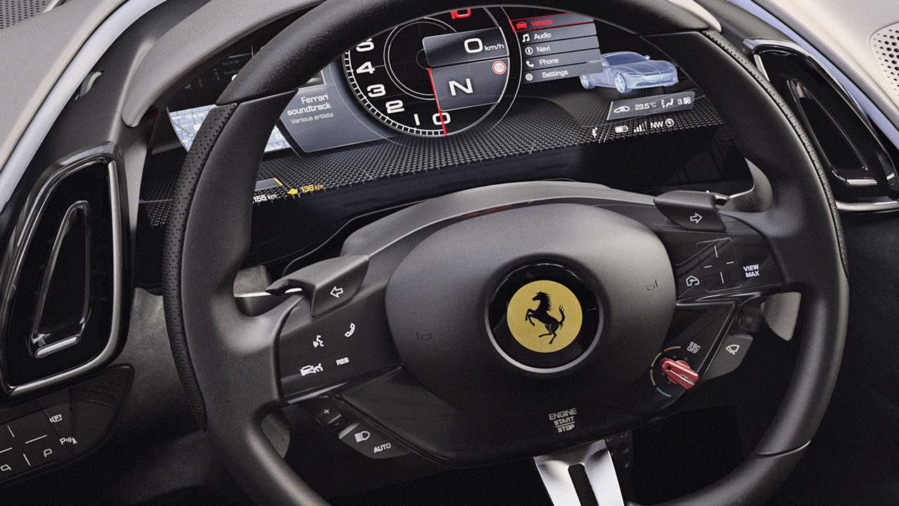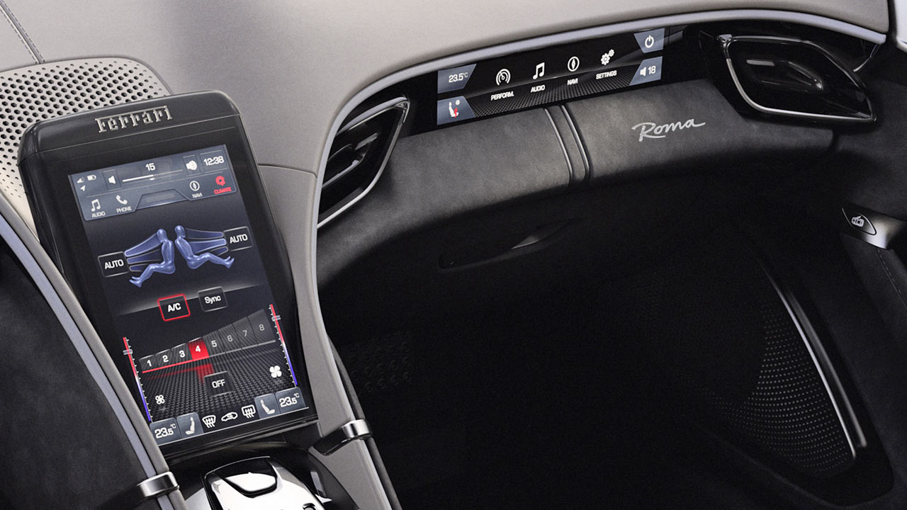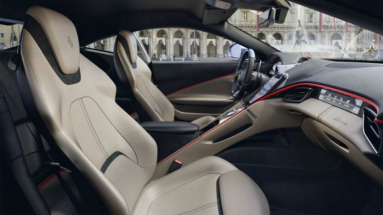 Unlike the exterior, the interior of the Roma looks a bit busy with its separate layouts for the driver and passenger. Both of them get their dedicated air vents and the passenger gets another display too. Just like in the SF90 Stradale, the gearbox controls mimic the gated shifts of the past. Ferrari classifies the Roma as a 2+ coupé, meaning there are two more (tiny) seats at the rear.
