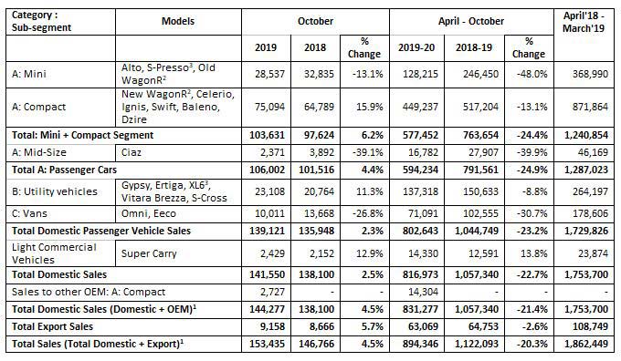 India’s largest carmaker Maruti Suzuki India (MSIL) sold a total of 153,435 units in October 2019, registering a growth of 4.5 percent compared to 146,766 units in the same period last year. The total October sales include 141,550 units in the domestic market, 2,727 units of domestic OEM sales and 9,158 units of exports.