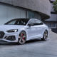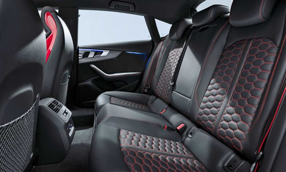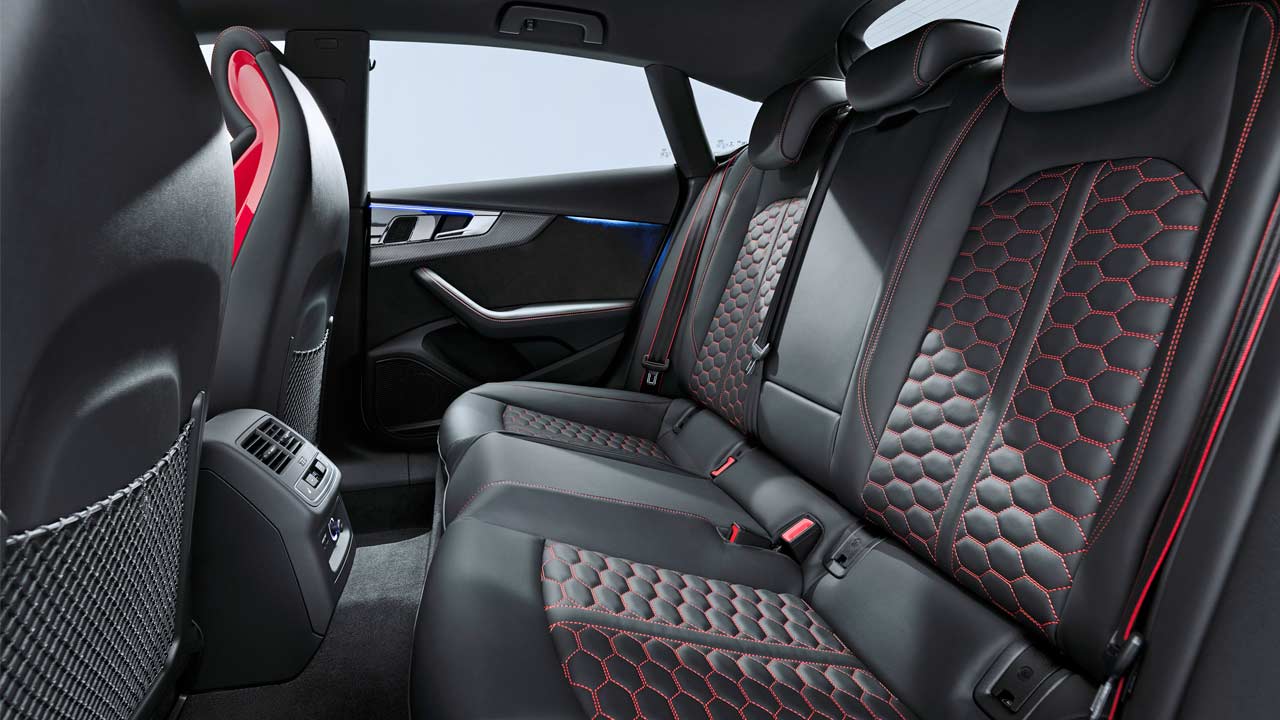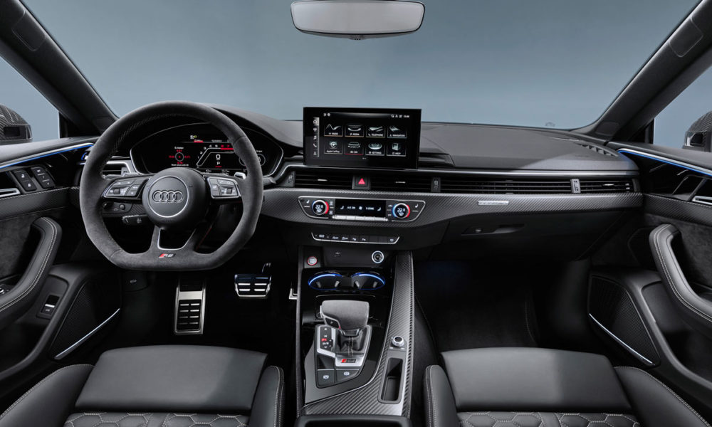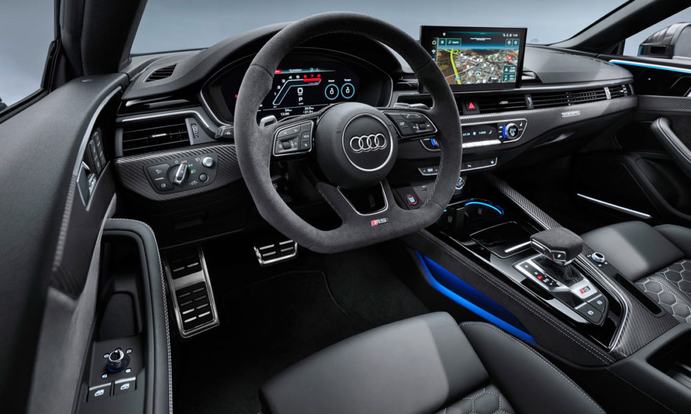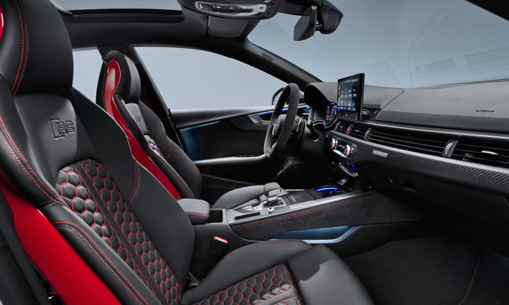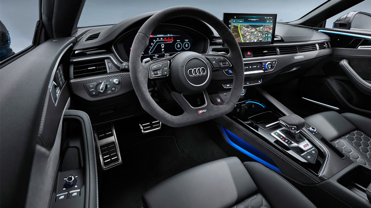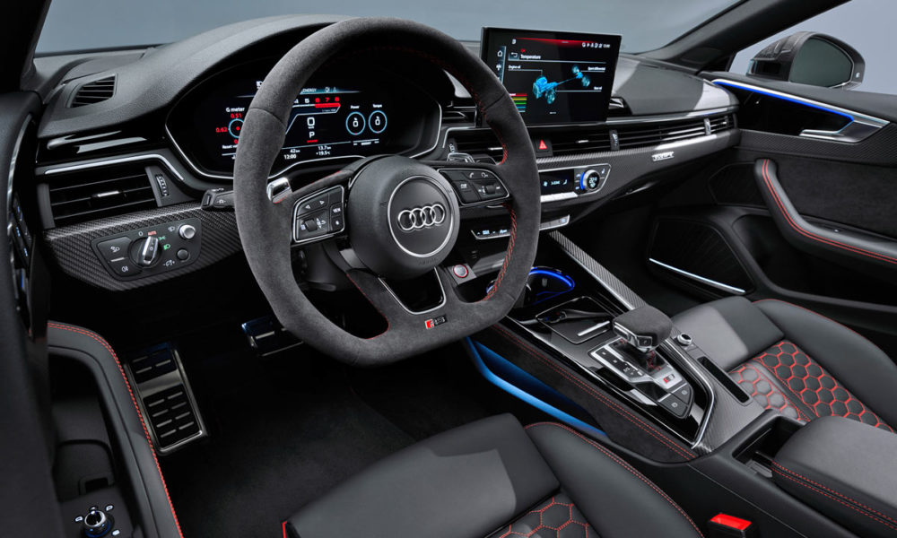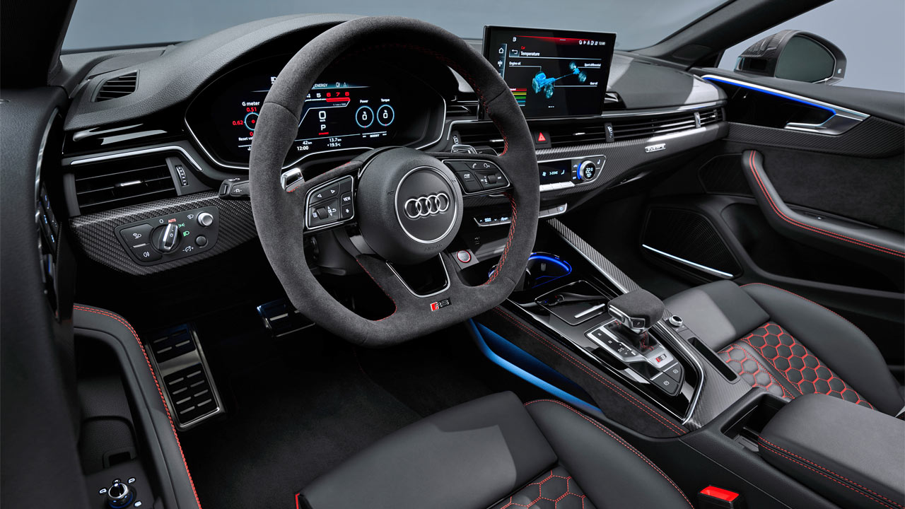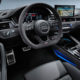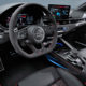 The fresh interiors feature the optional Audi virtual cockpit plus (12.3-inch display) with RS-specific graphics, 10.1-inch MMI touch display, and RS sport seats covered with Alcantara and leather as standard, or fine Nappa leather as an option, The RS design package with red or gray accents is available upon request.