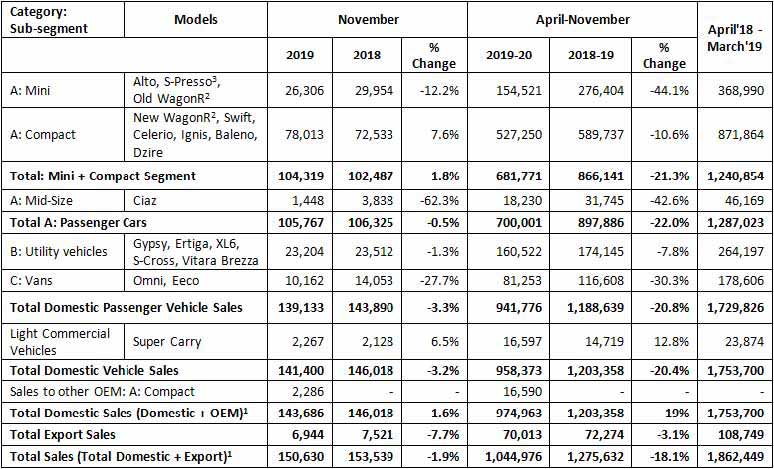 Maruti Suzuki India Limited (MSIL) sold a total of 150,630 vehicles in November 2019, registering a decline of 1.9 percent compared with 153,539 units in the same period last year. The total November sales includes 141,400 units in the domestic market, 2,286 units of domestic OEM sales and 6,944 units of exports.