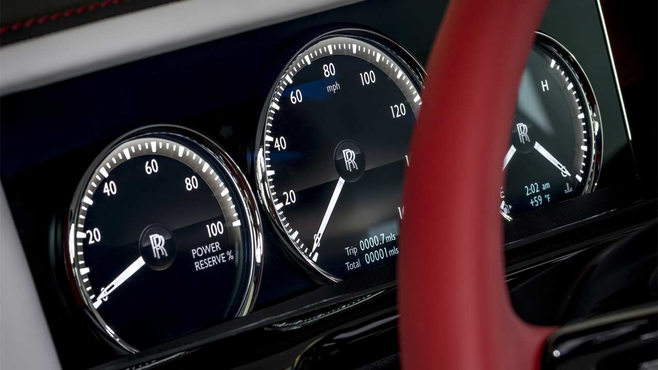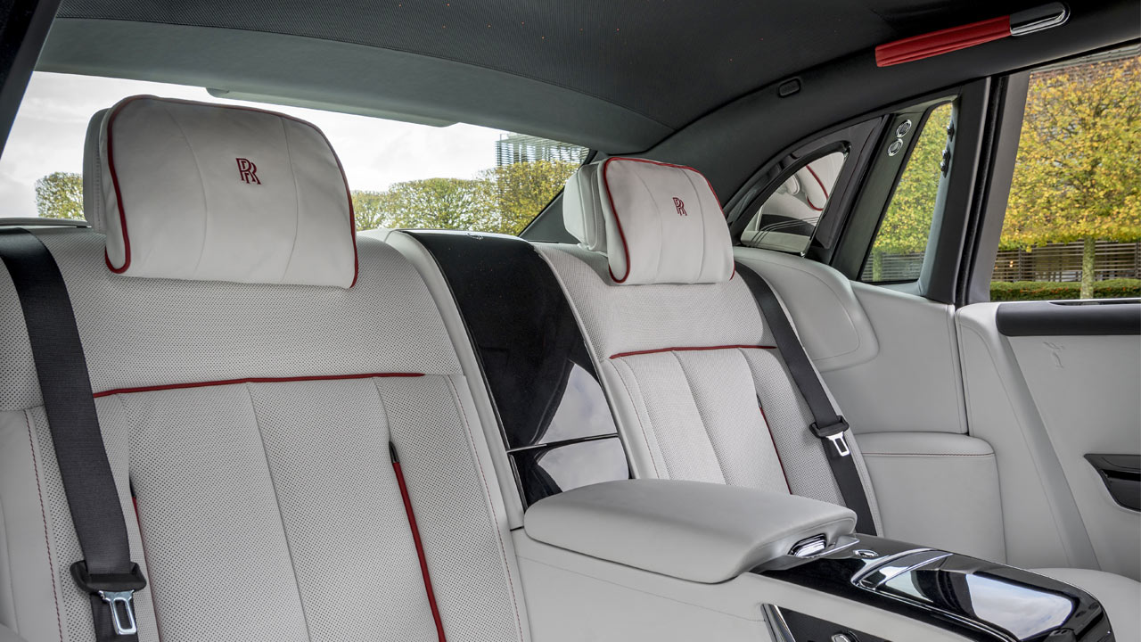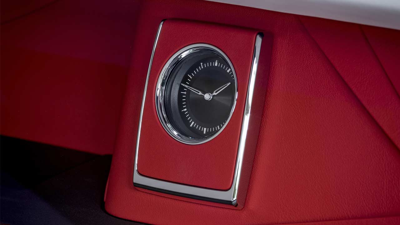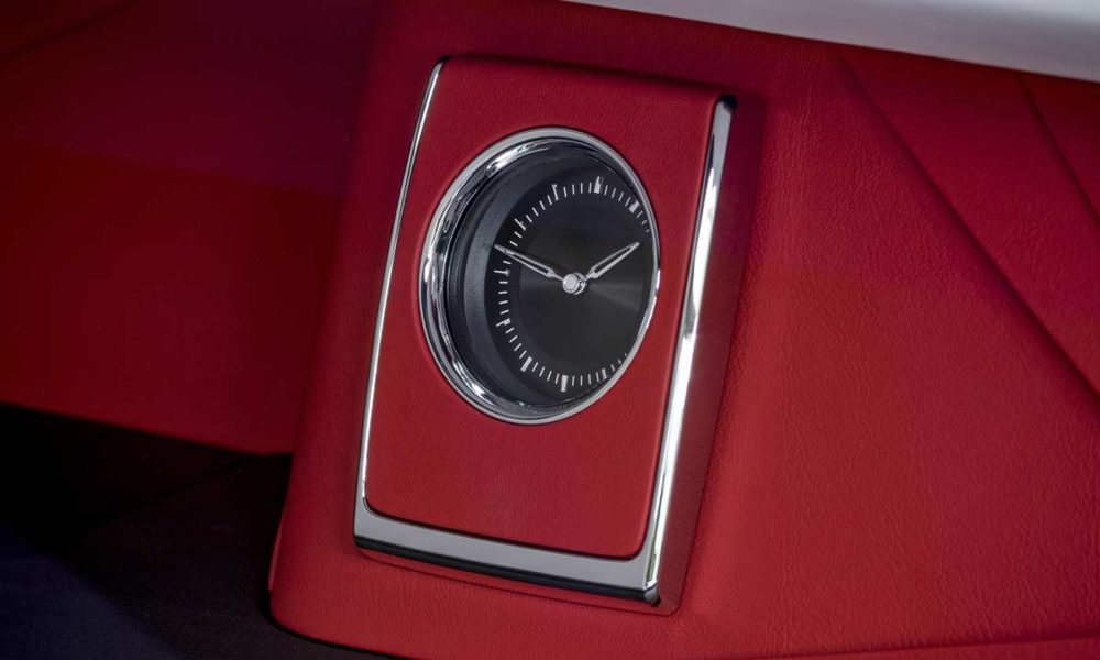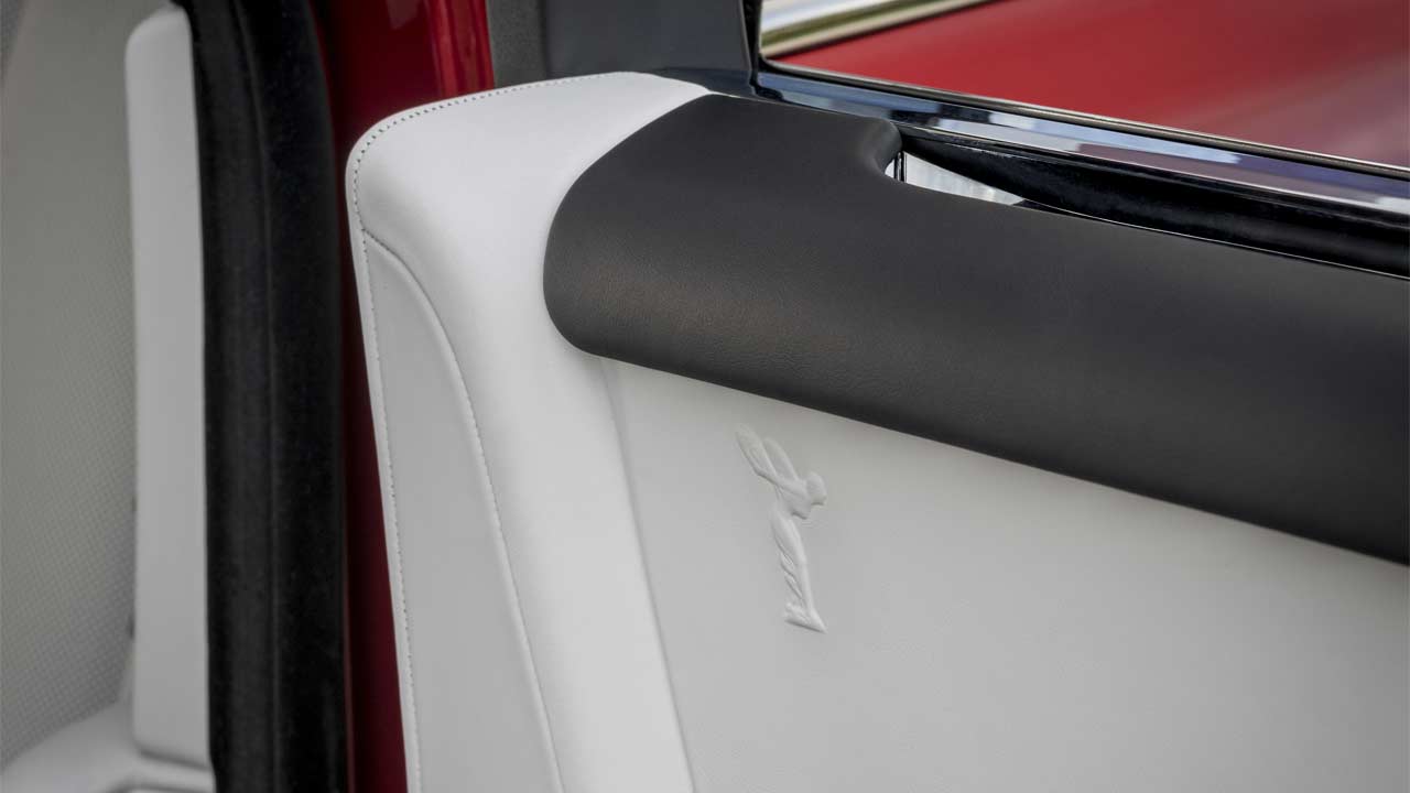 The bespoke Phantom’s exterior features particles of Crystal over Magma Red. The bespoke interior is upholstered in Brilliant Arctic White leather with bright Mugello Red highlights. The Shooting Starlight Headliner is also in Mugello Red. The Gallery on the dashboard has a theme called Red Regatta Sails, also finished in Mugello Red leather.