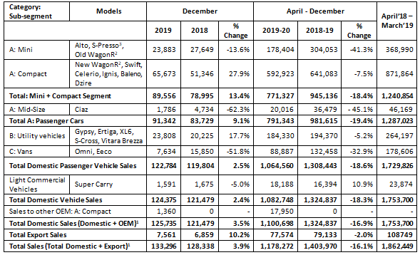 The domestic sales in December 2019 registered a 3.5 percent growth compared with the same period in 2018. The Mini segment which includes Alto and S-Presso seems to be declining while the Compact segment which includes Swift and Baleno, registered a growth of nearly 28 percent in December 2019. The UV segment too saw a growth of 17.7 percent led by the Vitara Brezza. The Ciaz sales continue to decline.