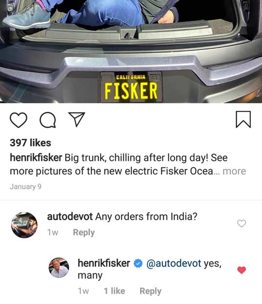 Replying to an Instagram comment, Mr. Fisker said that there have been many orders from India too.