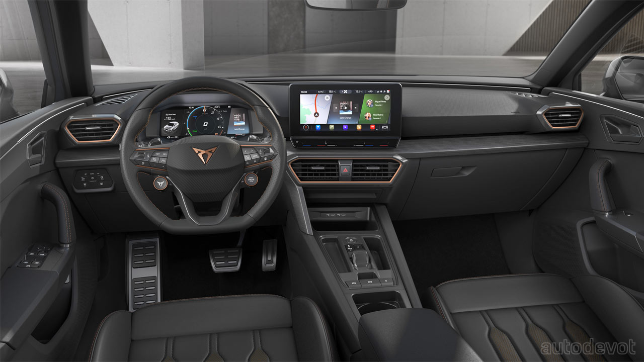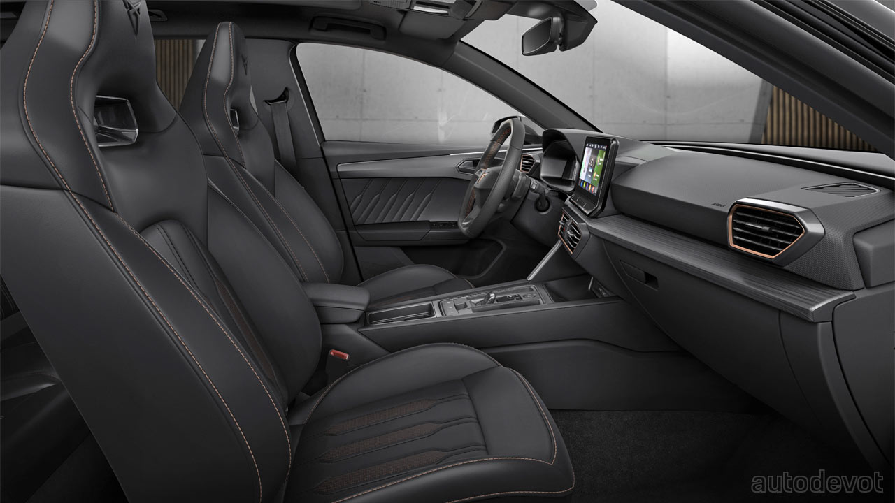 The Cupra Leon will also be available in three 2.0-litre 4-cylinder TSI petrol units. The line-up includes a 180 kW (245 hp) + 370 Nm and a 221 kW (300 hp) + 400 Nm variants. These two variants are front-wheel drive, available in both hatchback and Sportstourer body styles, and integrate an electronic limited-slip differential. The system takes readings from steering angle, wheel speed and yaw for a reassuring dynamic driving experience.