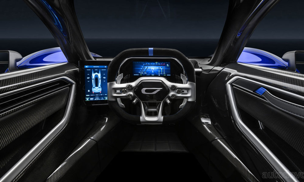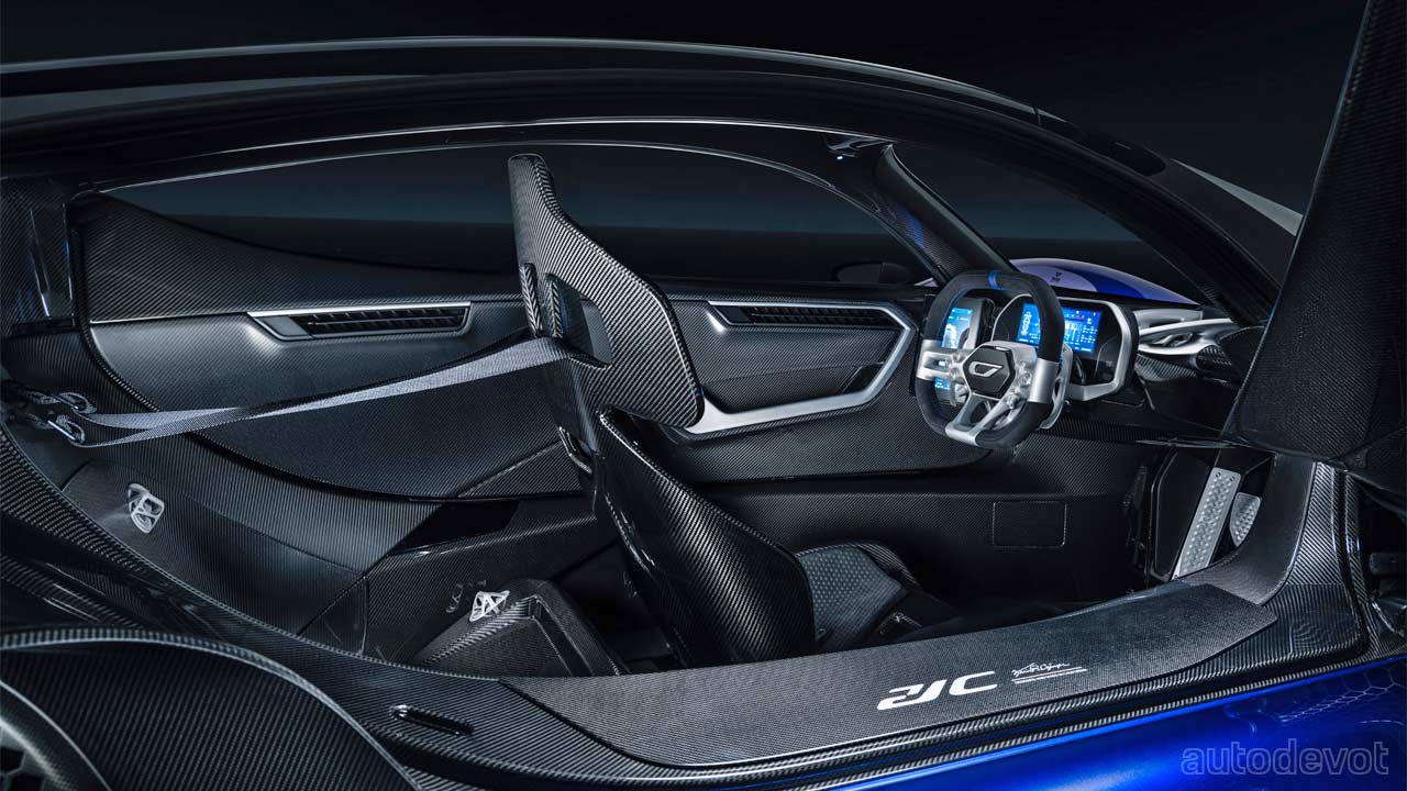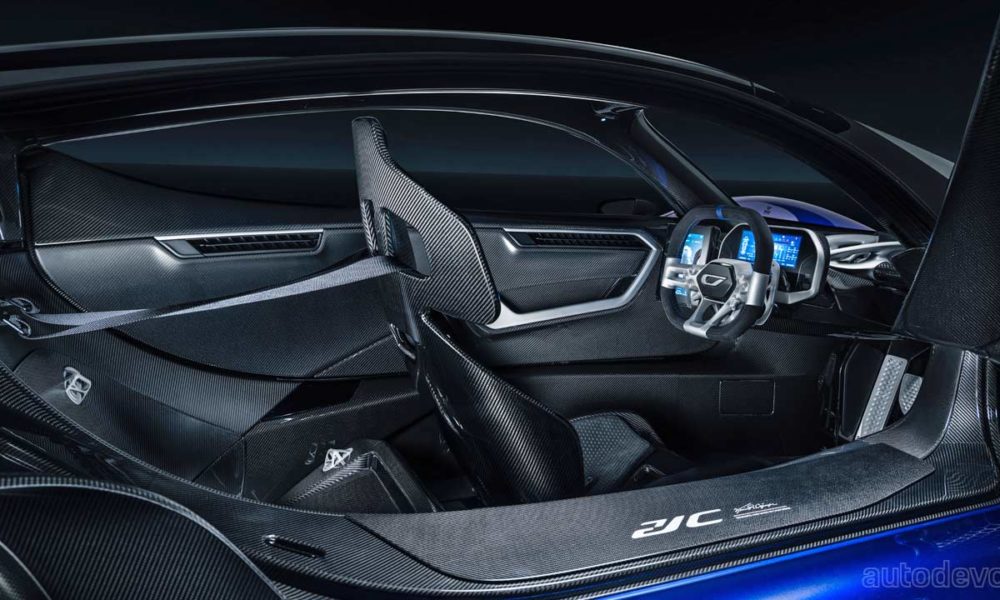 The interior as we can see has an interesting, fighter jet cockpit-like layout with the passenger seat right behind the driver. There’s one large door for both the occupants. Naturally, the track-focused version sports a stripped-down look with rear seat delete and more exposed carbon fibre. The driver seat on the road version appears to be a bit more comfortable to sit on.