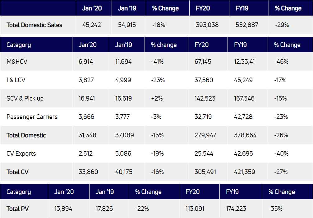 Commercial vehicle domestic sales in January 2020 was ~15% lower than last year. Retail was ahead of wholesale for 7th straight month in a row, helping further stock reduction, as we move closer to BSVI transition. With increasing buying interest, particularly amongst fleet owners, the M&HCV sale in January 2020 was second highest in the last 7 months. In Small commercial vehicles, the buying interest continued to be better than other segments, resulting in a YOY growth of 2%. – Girish Wagh, President, CVBU, Tata Motors