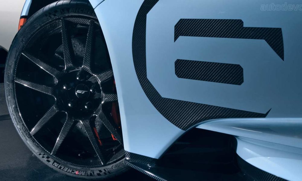 The photos here feature a new Liquid Carbon edition and an updated Gulf Racing Heritage livery. The former’s carbon fibre body is completely free of any paint except for a special clearcoat. The GT Liquid Carbon features carbon fibre wheels as standard; owners can choose titanium lug nuts, six-point racing harness anchors, five interior options and five caliper colors.