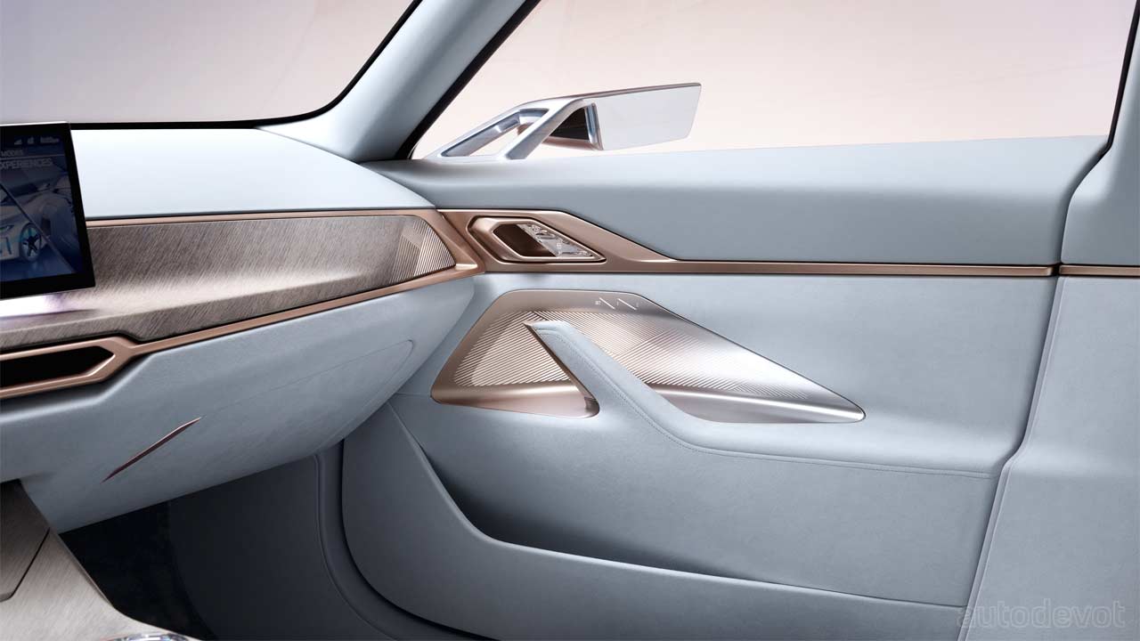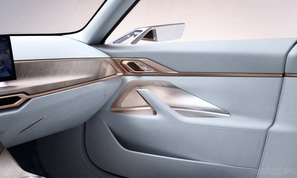 The exterior of the Concept i4 is dominated by BMW’s controversial new grille and the “love it or hate it” philosophy continues here too. The concept is painted in Frozen Light Copper with a subtle application of Blue elements in the front, flanks and the rear-end, suggesting the obvious.