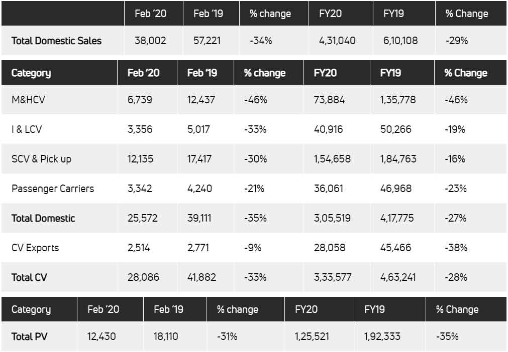 Total MHCVs sales in February 2020 including MHCV Trucks, Buses and International Business stood at 8,830 units compared to 14,468 units last year.