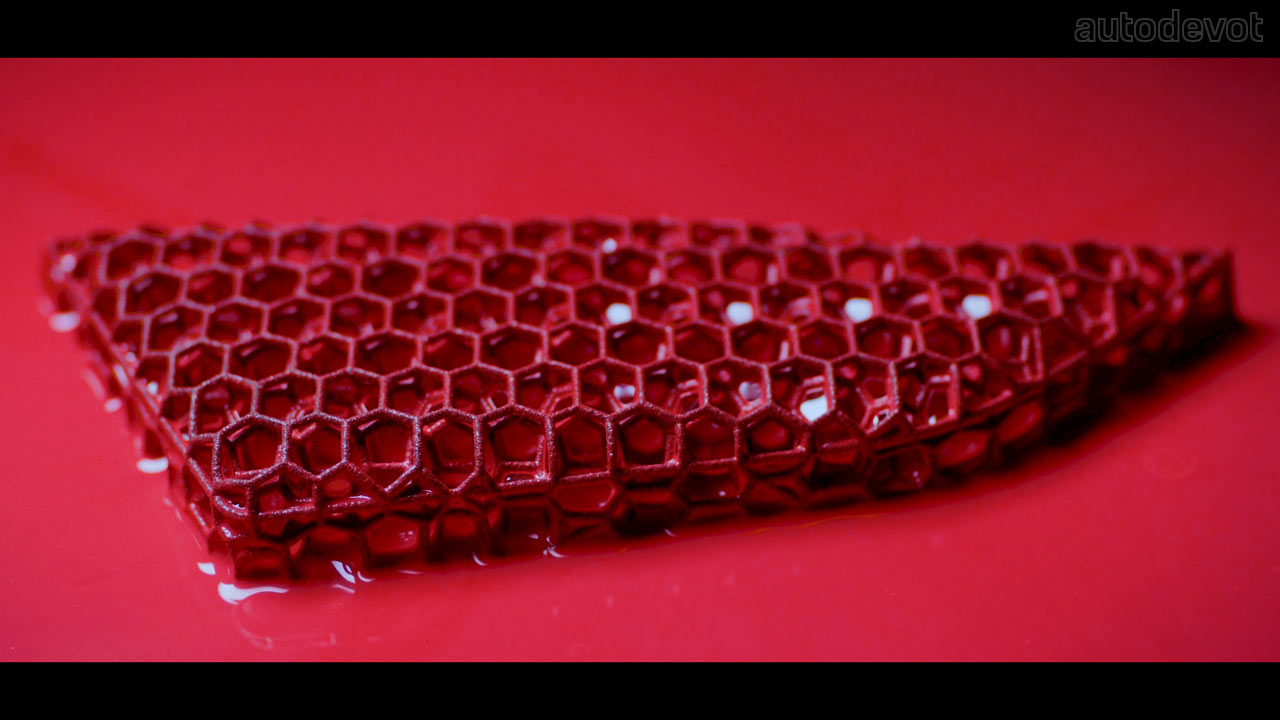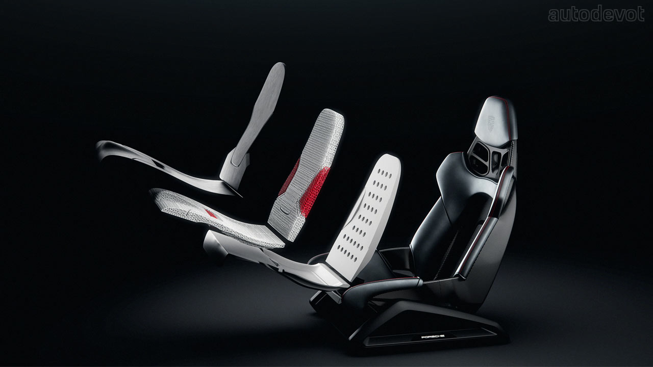 The ‘3D-printed bodyform full-bucket seat’ is based on Porsche’s lightweight full-bucket seat and features a sandwich construction: a base support made from expanded polypropylene (EPP) is bonded to a breathable comfort layer consisting of a mixture of polyurethane-based materials made using additive manufacturing – a 3D-printer.