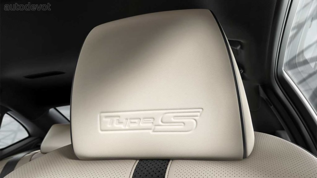 In addition to unique materials and colors, the Type S interior is distinguished by Type S badging on the door sills, steering wheel and embossed headrests.