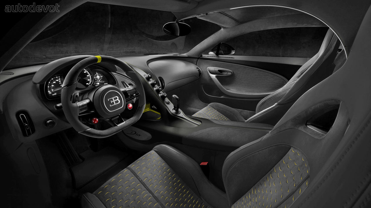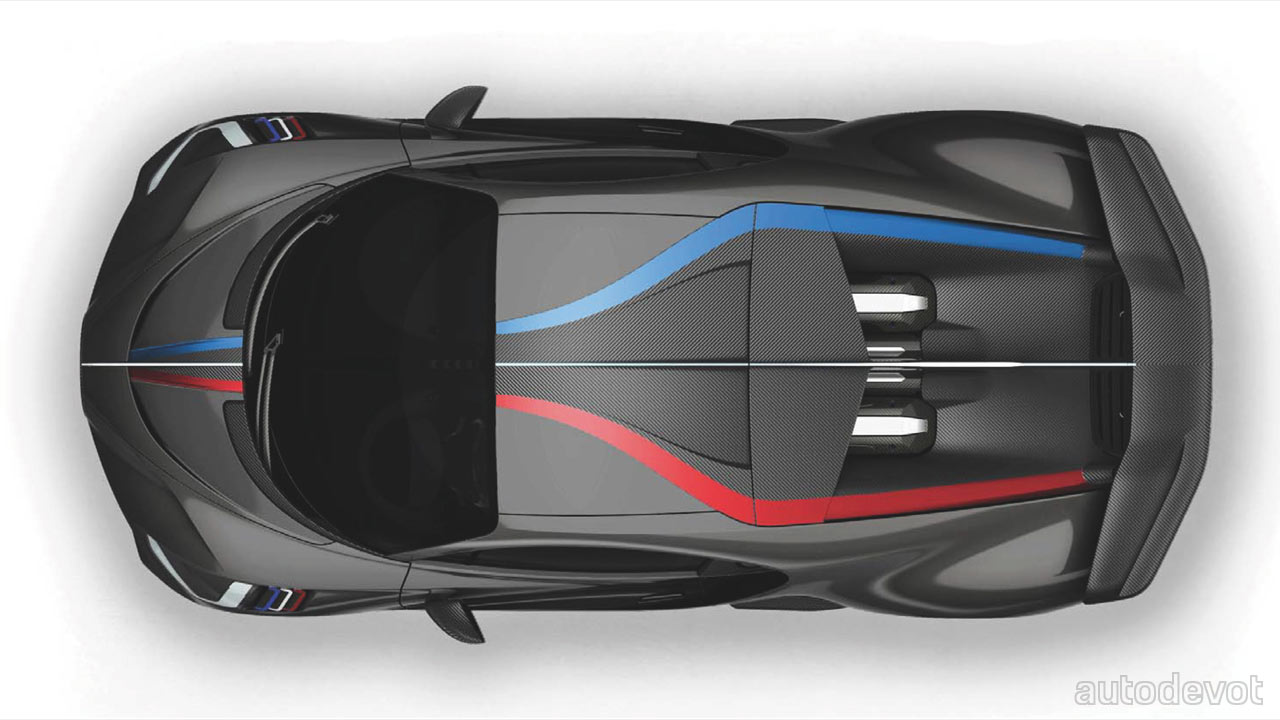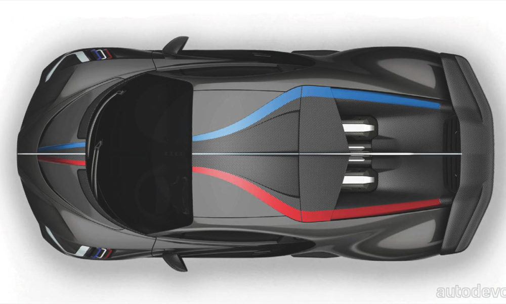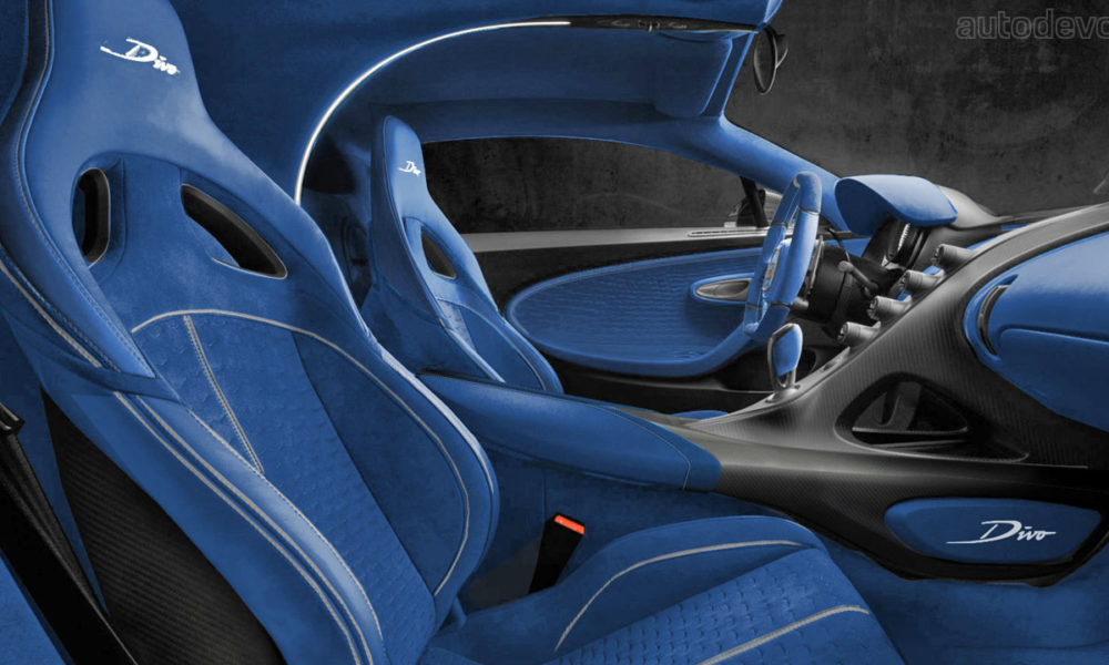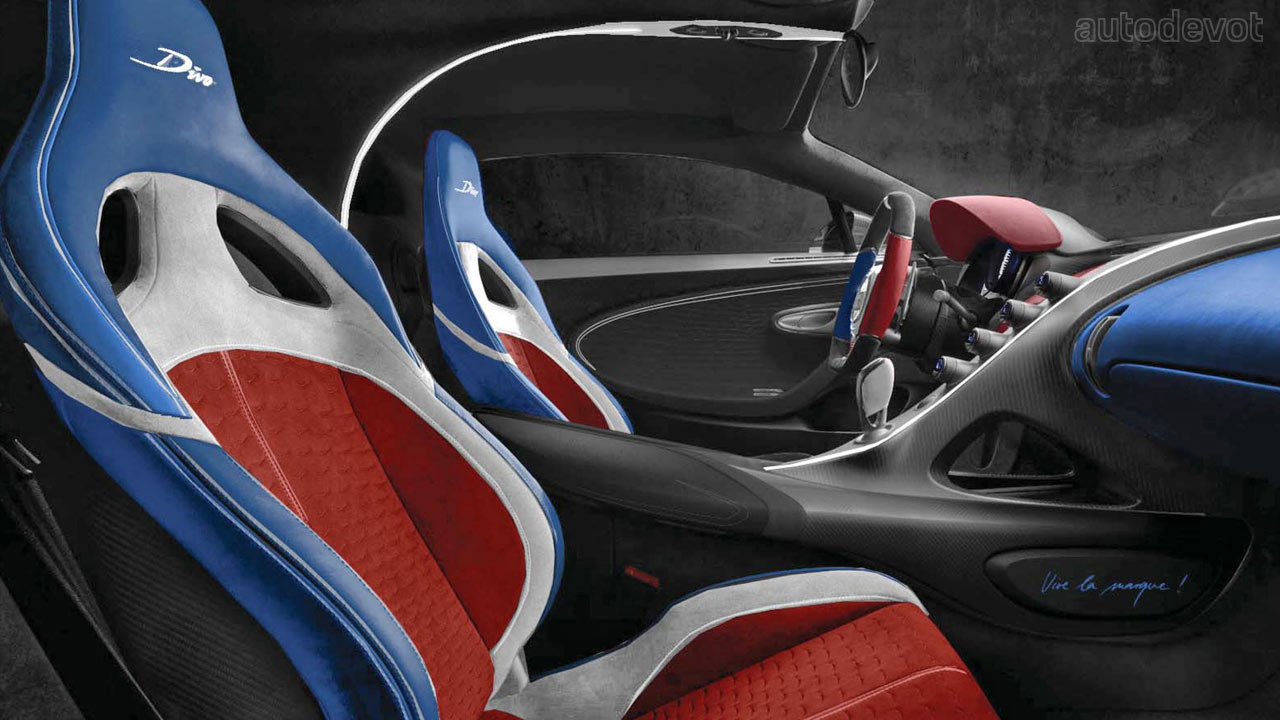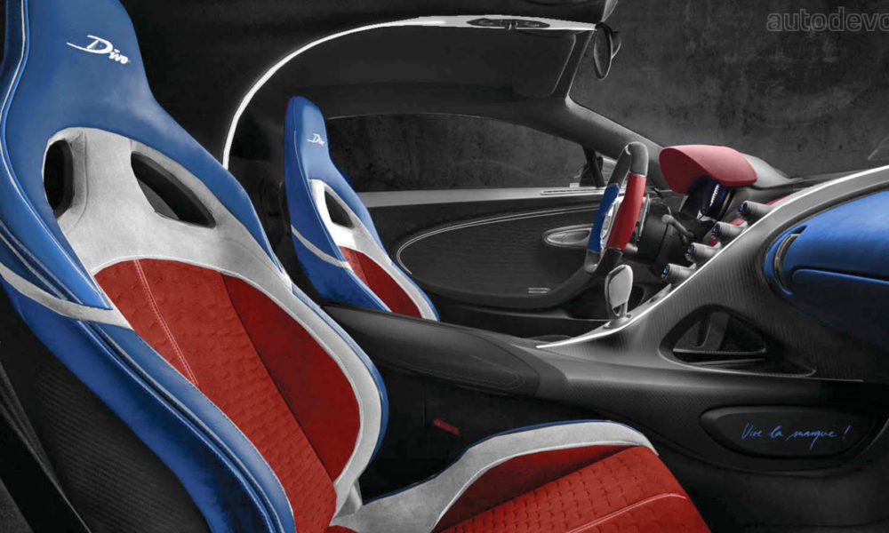 Each €5 million paying customer will be able to choose their own paint, leather, fabrics and stitching. They can also introduce their own design ideas to make the car even more personal as long as their wishes don’t impair the safety or change the Bugatti logo. The renderings here showcase some of the customized examples. The yellow-black combo is inspired by the Type 55 – Ettore’s Bugatti’s favorite colors; another example here celebrates French colors; the featured photo is one more example of a customized Divo inspired by a customer’s Chiron.