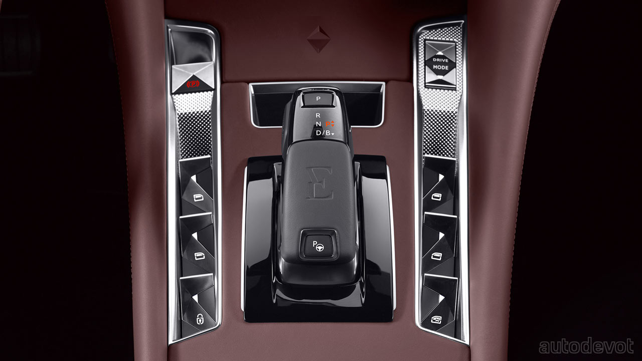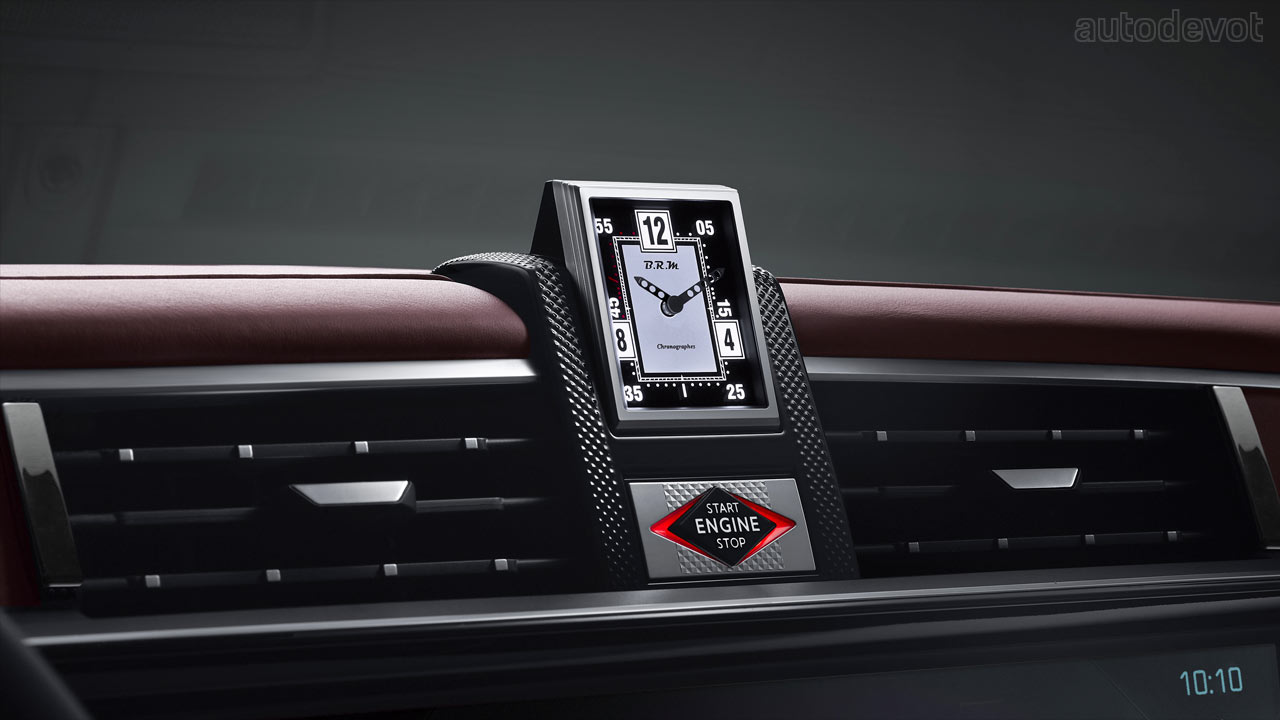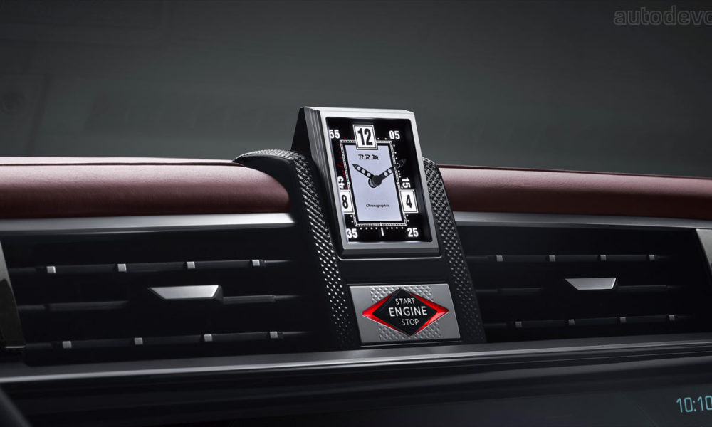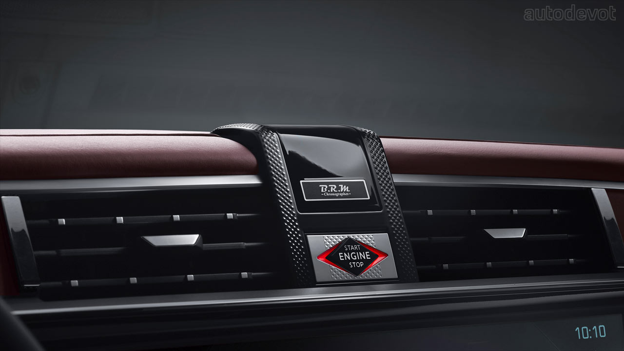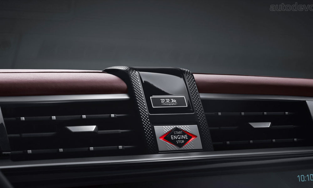 The attention to detail includes crystal-shaped touch-sensitive buttons and of course, the watchstrap-like design in between the air vents. The timepiece rotates 180° for added drama. Also, notice the detailing on the engine start/stop switch. Depending on the variant, other features include multi-coloured ambient lighting and Focal Electra audio system.