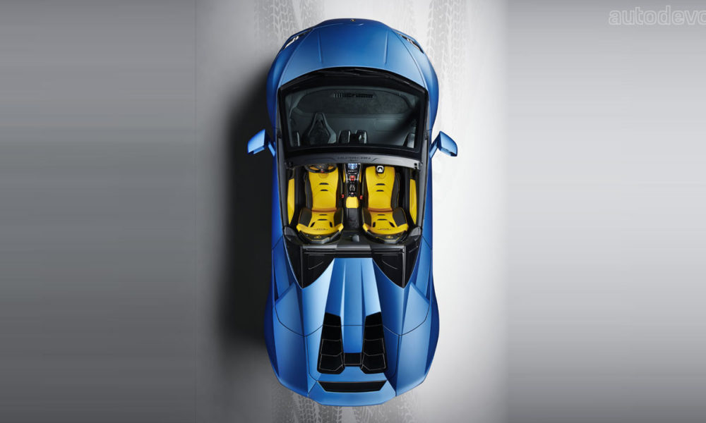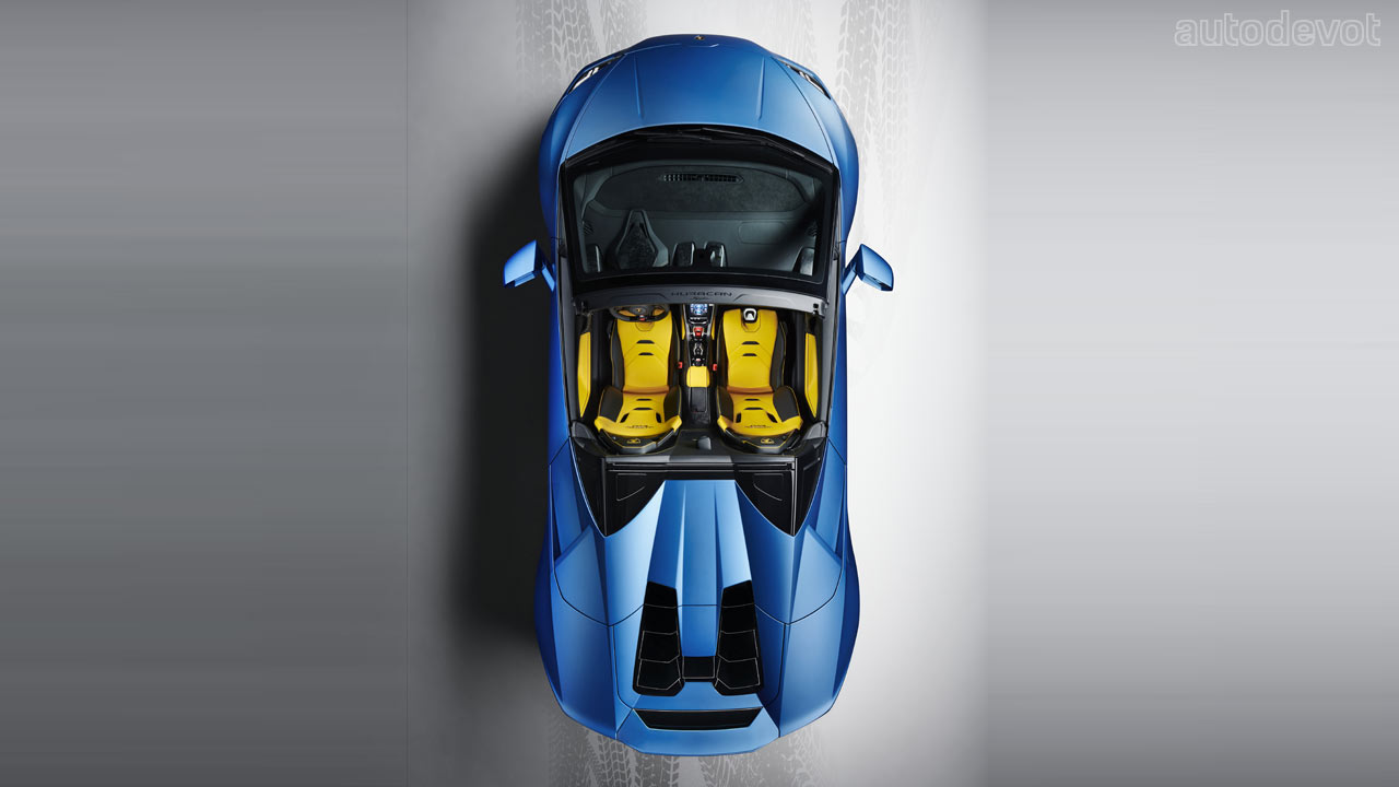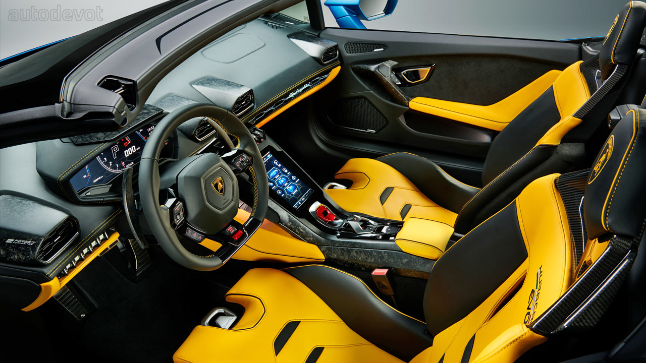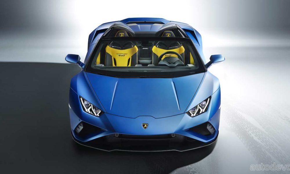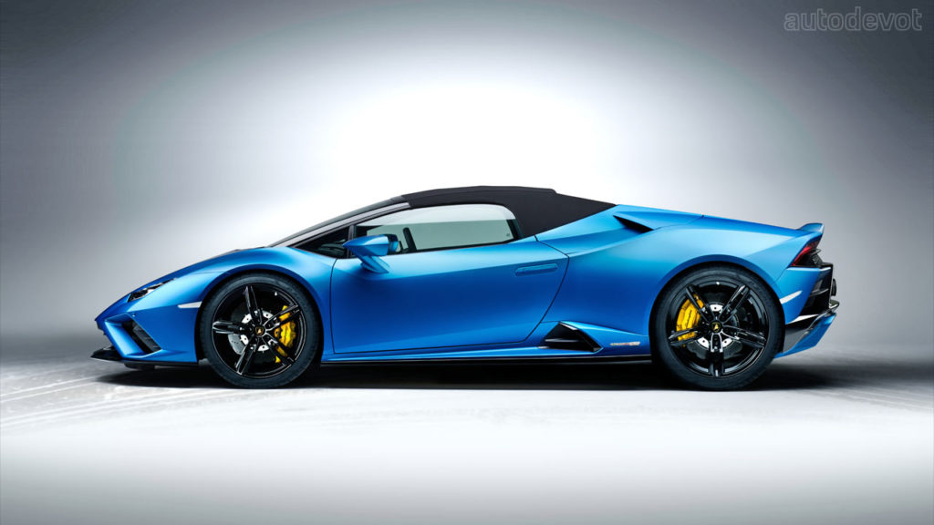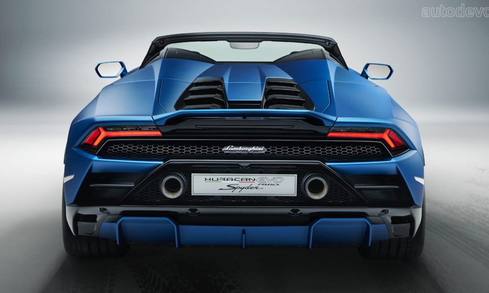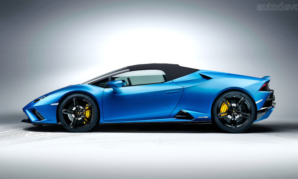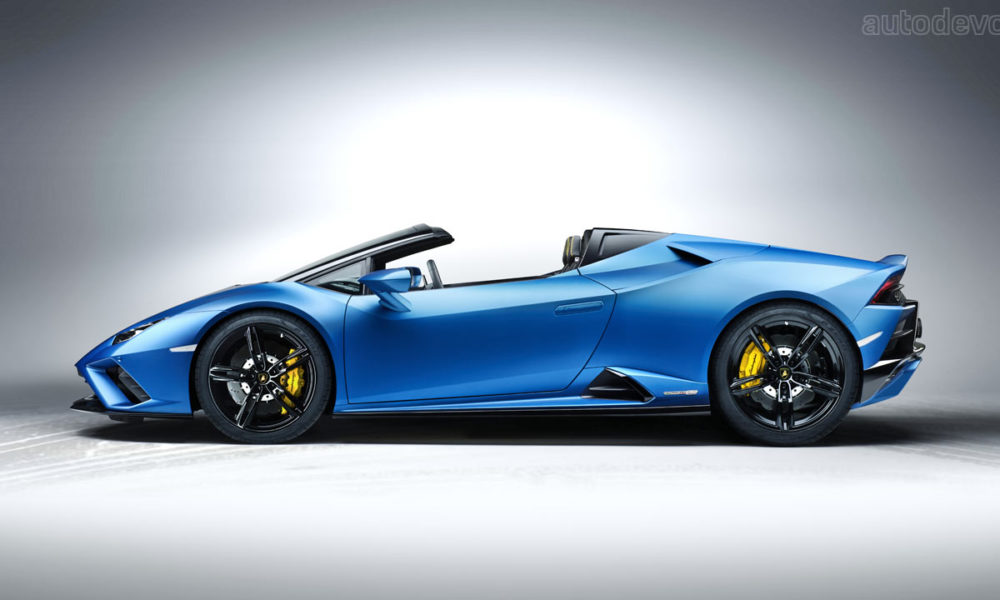Just like in the AWD Huracán EVO Spyder, the soft-top roof can be operated at speeds of up to 50 km/h (31 mph) and takes about 17 seconds to get stowed under the tonneau cover. The roof system and additional reinforcements seem to have added 120 kg to the RWD Spyder’s 1,509 kg dry weight.
