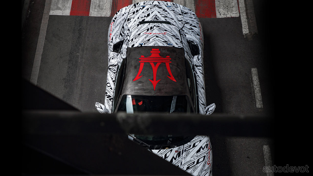 The MC20 is expected to pack an in-house developed motor, rumored to be a twin-turbo V6. The top-down shot reveals what appears to be an active rear spoiler.