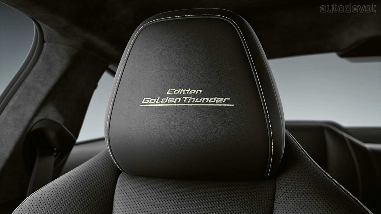 Inside, the special edition features BMW Individual Merino leather upholstery in black with “Edition Golden Thunder” embroidered on the front headrests; BMW Individual Alcantara Anthracite roof liner (for Coupe and Gran Coupe), and accents in Aluminium Mesh Effect Gold.