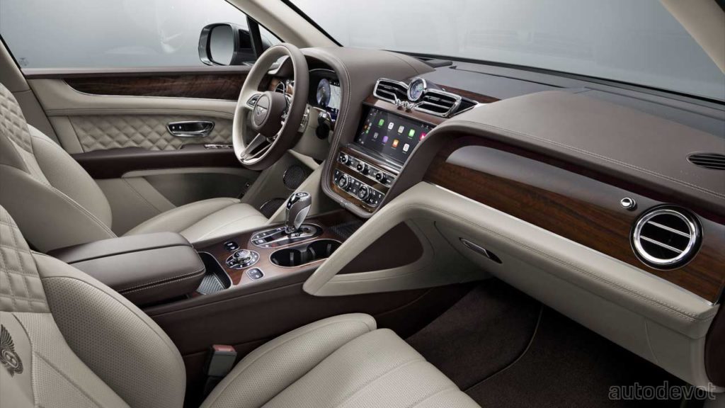 The refreshed cabin features a pair of new central air vents (from the Flying Spur) that replace the traditional ‘bullseye’ circular vents. A Breitling clock has been neatly integrated into the centre of those wing-shaped vents. Other features include a new 10.9-inch touchscreen, wireless Apple CarPlay & Android Auto connectivity, USB-C ports, wireless smartphone charging, My Bentley connected services enabled by an embedded SIM, and 12-speaker Bentley audio system. Options include a 20-speaker Naim audio system.
